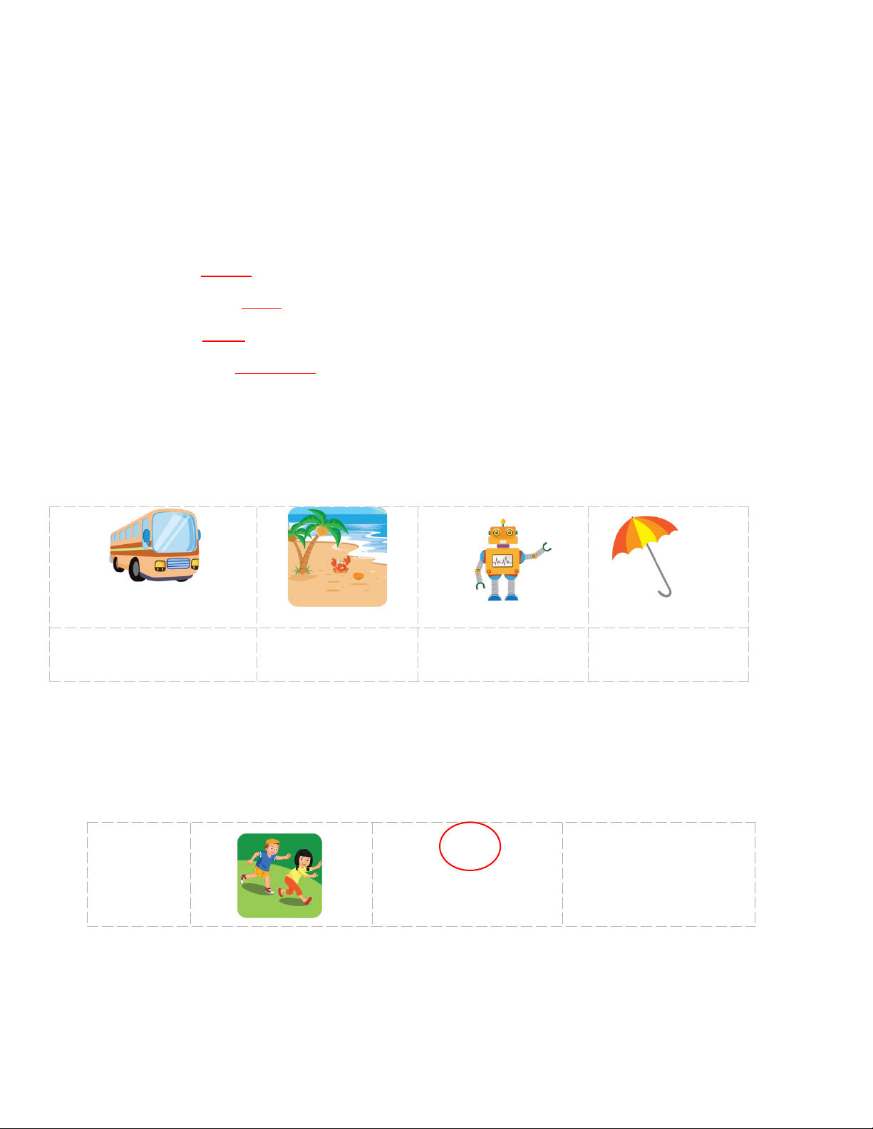 1. I want to go to the beach. 2. I can see a bus 3. It’s an umbrella 0. I have a robot.
