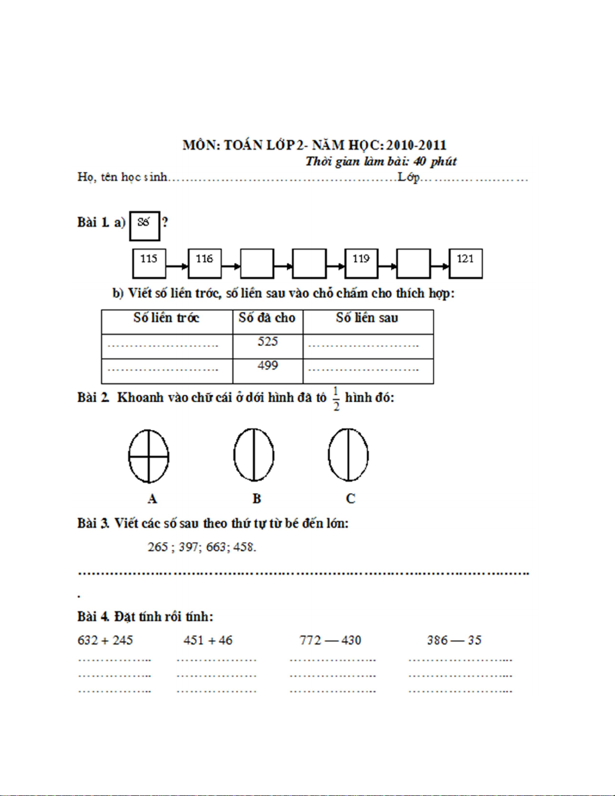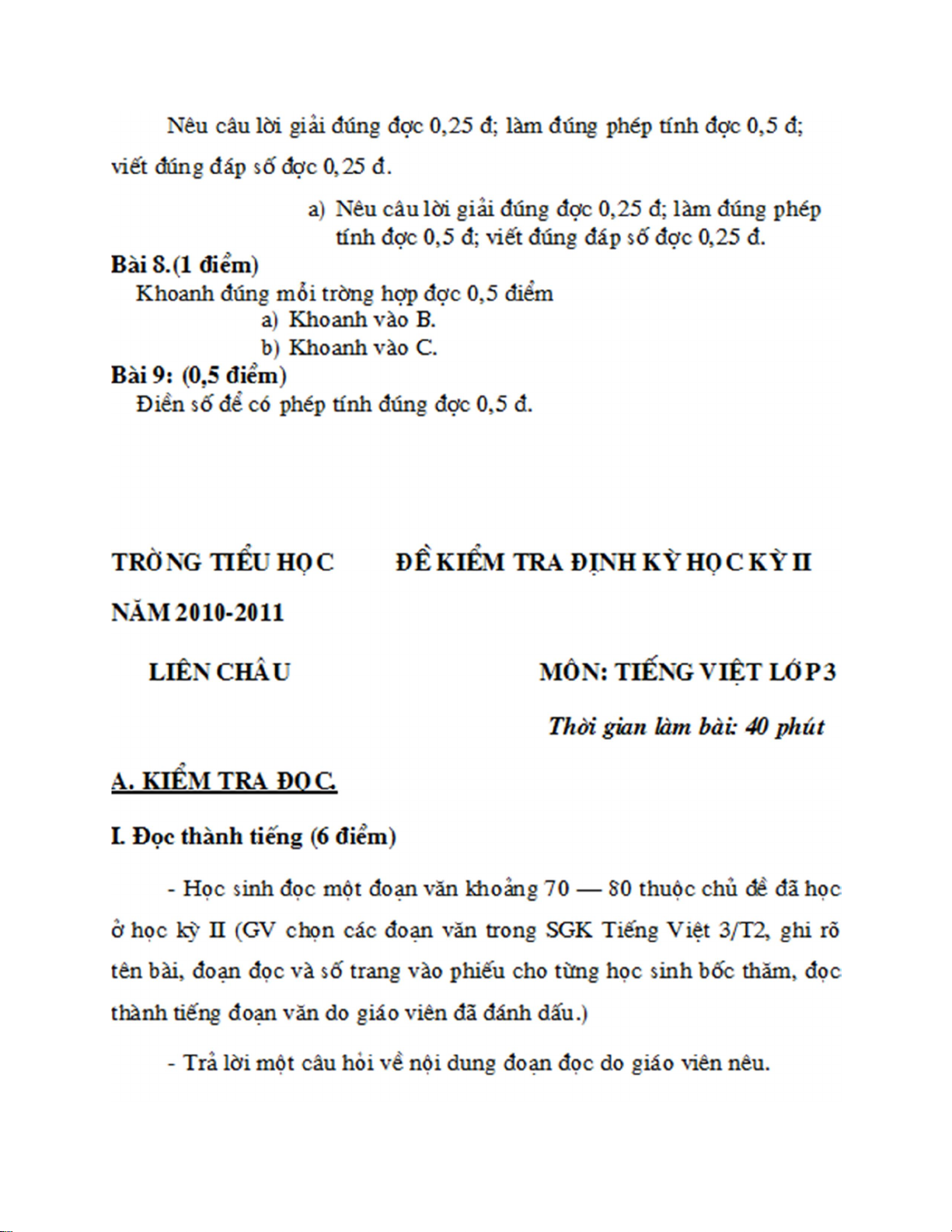 ĐỀ KIỂM TRA HỌC KỲ II – LỚP 2 NĂM HỌC 2010-2011 TRƯỜNG TIỂU HỌC LIÊNCHÂU