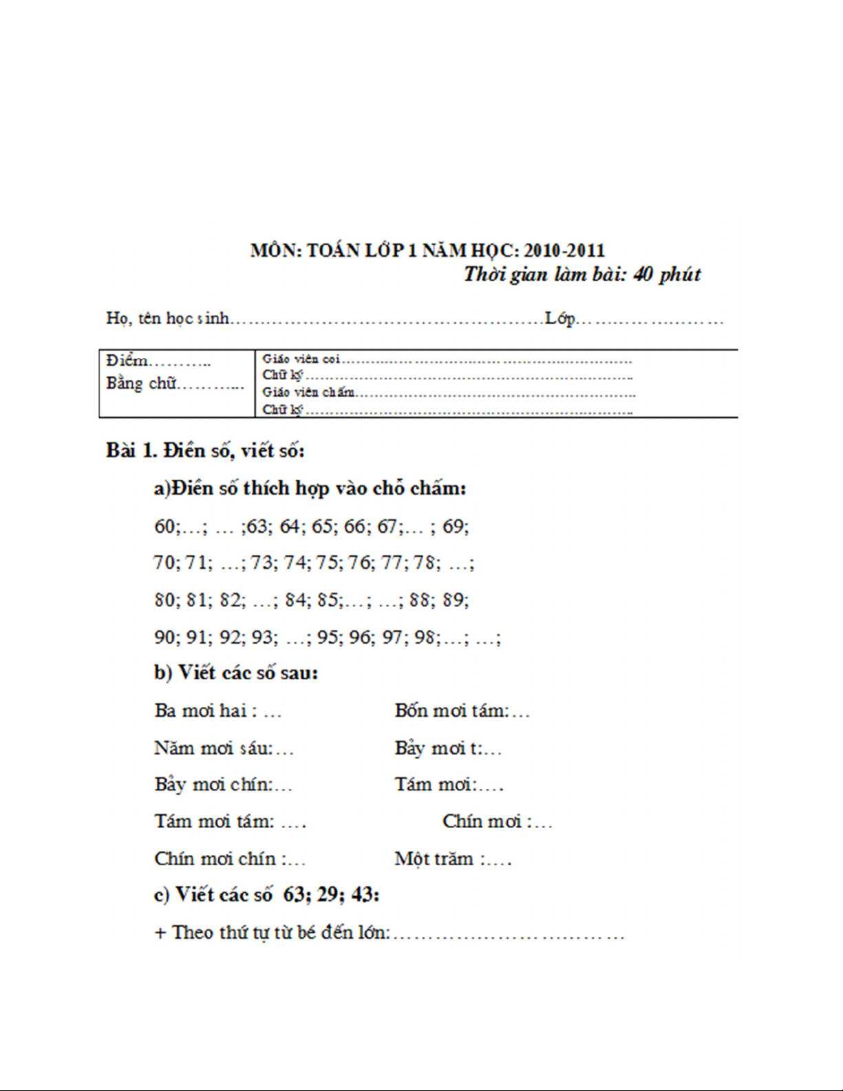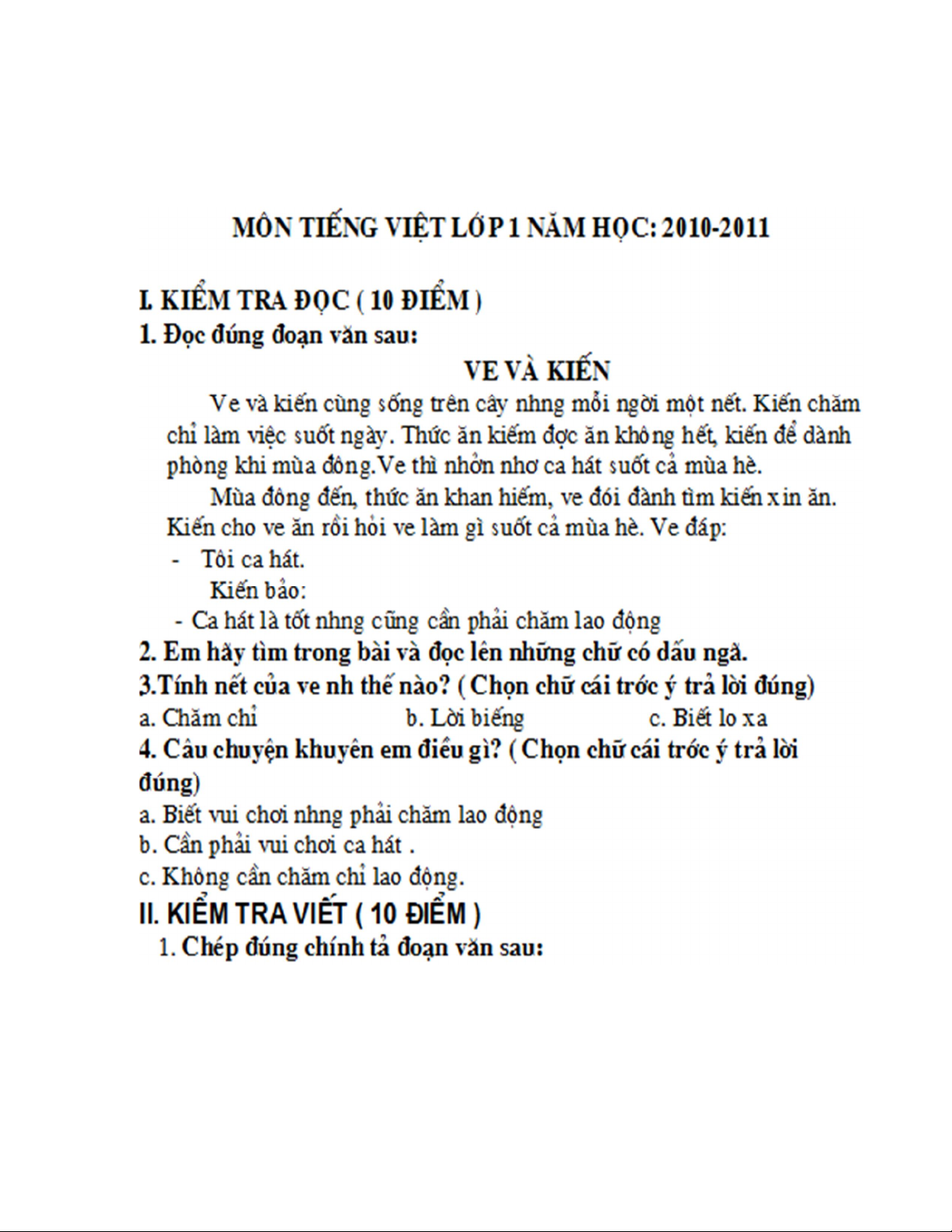 ĐỀ KIỂM TRA HỌC KỲ II – LỚP 1 NĂM HỌC 2010-2011 TRƯỜNG TIỂU HỌC LIÊN CHÂU