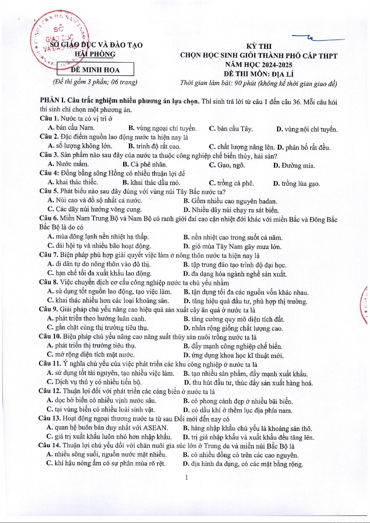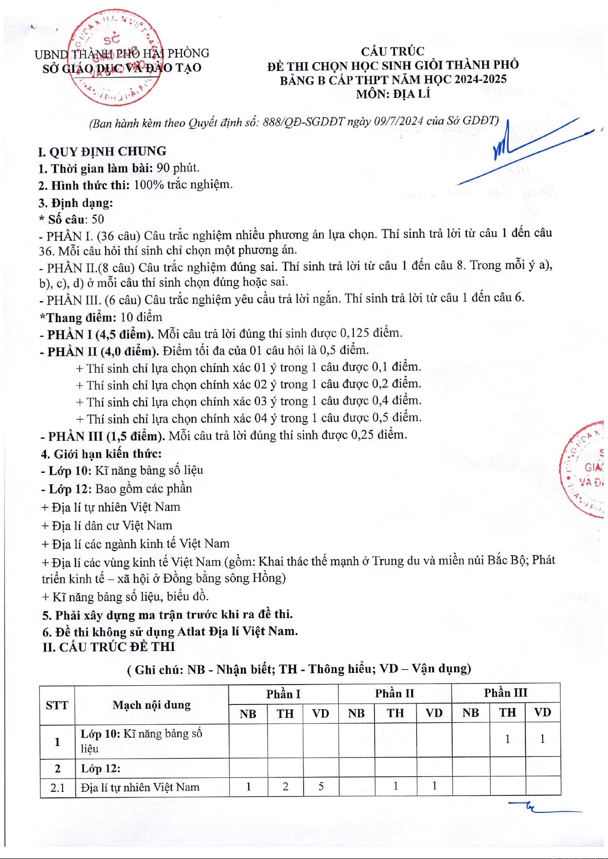 Bản cấu trúc đề thi Địa lí THPT cấp thành phố này cung cấp một cái nhìn toàn diện về kỳ thi học sinh giỏi năm học 2024-2025 tại Hải Phòng. Kỳ thi kéo dài 90 phút, hoàn toàn bằng hình thức trắc nghiệm với tổng số 50 câu hỏi được phân bổ thành ba phần chính: trắc nghiệm nhiều phương án, trắc nghiệm đúng/sai và trắc nghiệm trả lời ngắn. Phương pháp đánh giá được thiết kế để phân loại rõ ràng theo các cấp độ tư duy: nhận biết, thông hiểu và vận dụng, đảm bảo tính khách quan trong việc chọn lọc học sinh giỏi. Giới hạn kiến thức bao gồm các nội dung cốt lõi của môn Địa lí lớp 10 (chủ yếu là kĩ năng bảng số liệu) và Địa lí lớp 12, bao quát toàn diện các mảng Địa lí tự nhiên, Địa lí dân cư, Địa lí các ngành kinh tế, và Địa lí các vùng kinh tế của Việt Nam, cùng với kĩ năng đọc bảng số liệu và biểu đồ. Tài liệu cũng đặc biệt nhấn mạnh yêu cầu xây dựng ma trận đề thi trước khi ra đề và không sử dụng Atlat Địa lí Việt Nam, hướng đến việc đánh giá sâu sắc kiến thức và kĩ năng nội tại của thí sinh. Những quy định này tạo điều kiện cho một kỳ thi chuẩn hóa, giúp học sinh phát triển năng lực tư duy địa lí và ứng dụng kiến thức vào giải quyết vấn đề.