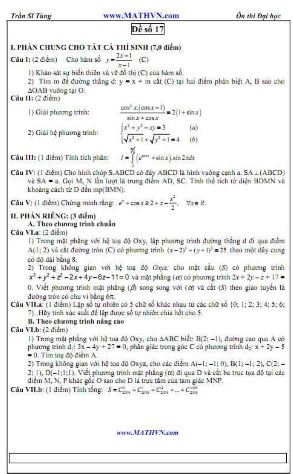 Đề ôn thi Đại học môn Toán - Trần Sĩ Tùng - Đề số 17