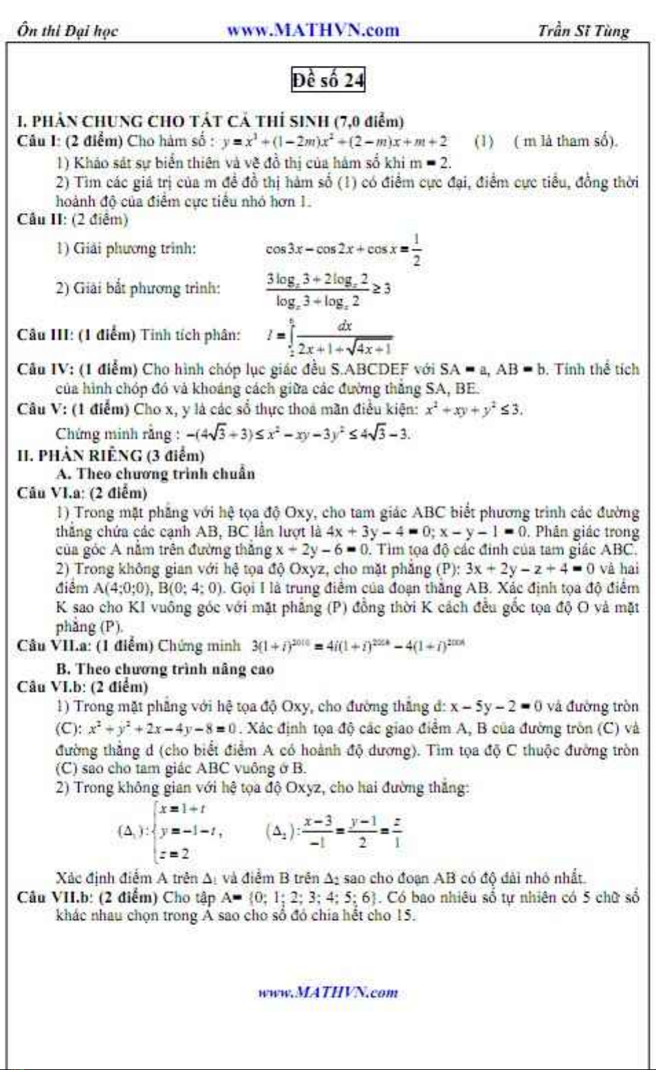 Đề ôn thi Đại học môn Toán - Trần Sĩ Tùng - Đề số 24