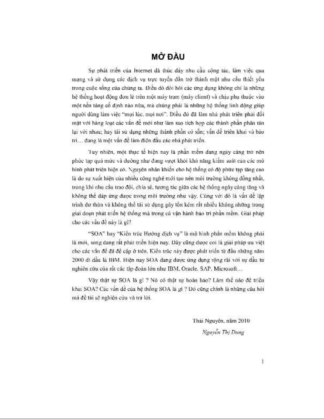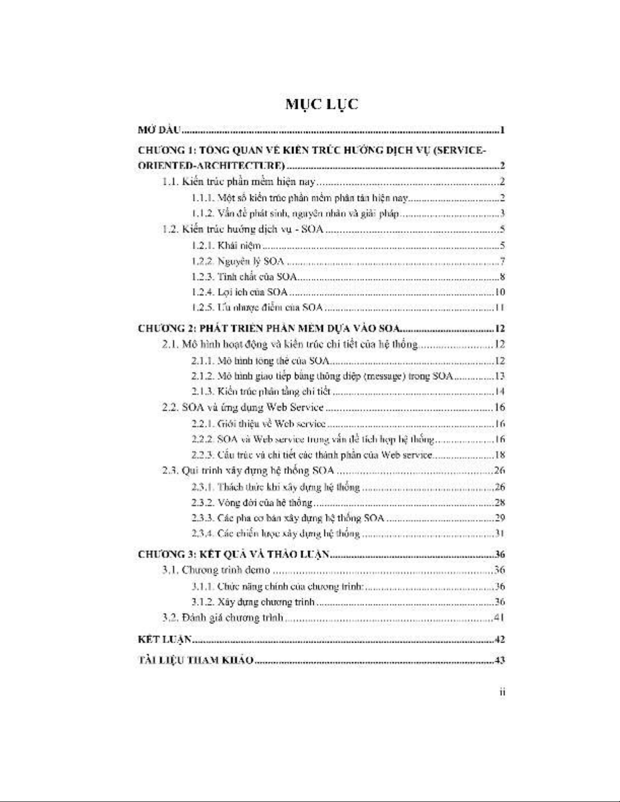 Ngoài phần Mở đầu, Kết luận, đề tài có kết cấu gồm 3 chương: Tổng quan về kiến trúc hướng dịch vụ và ứng dụng (Service-Oriented-Architecture), phát triển phần mềm dựa vào SOA, kết quả và thảo luận.
