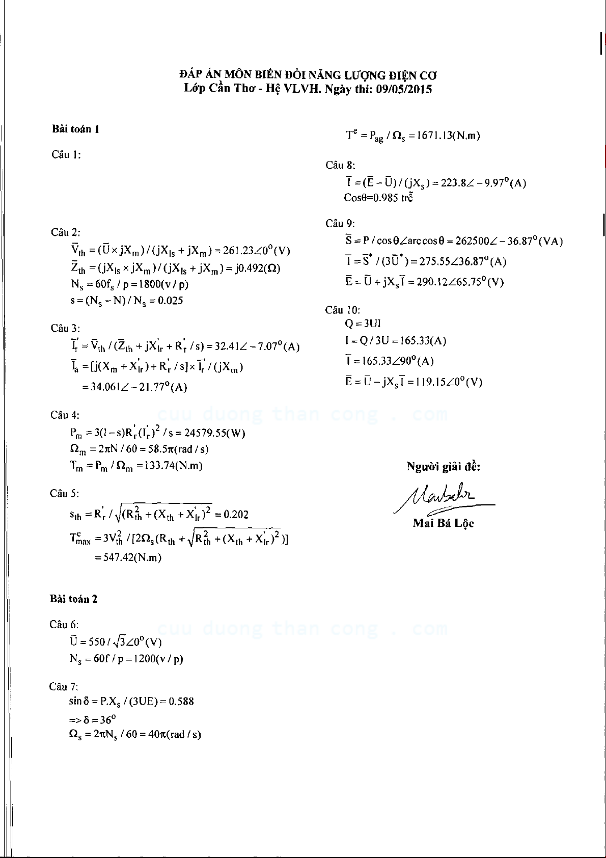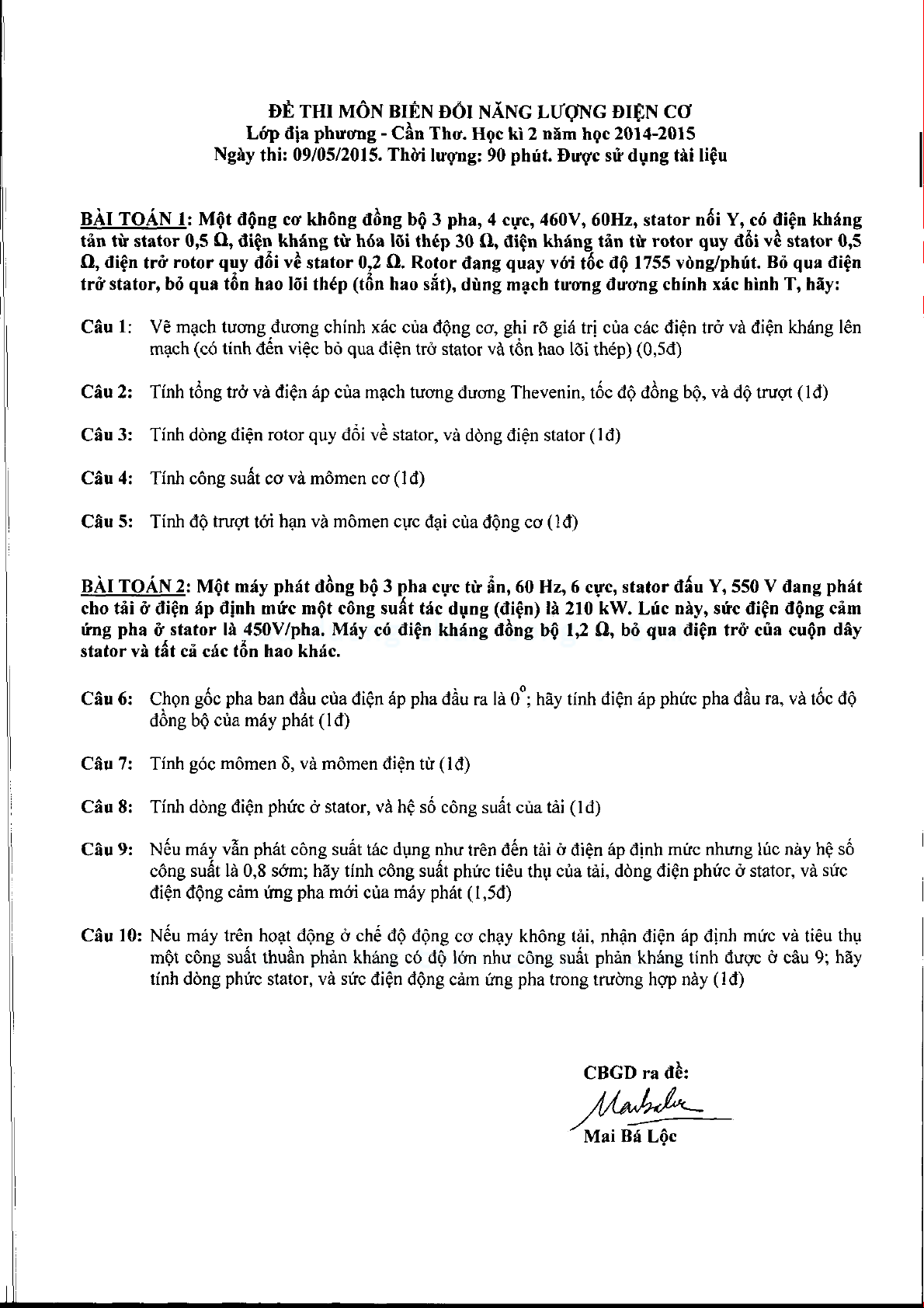 Đề thi môn Biến đổi năng lượng điện cơ học kỳ 2 năm 2014 - 2015