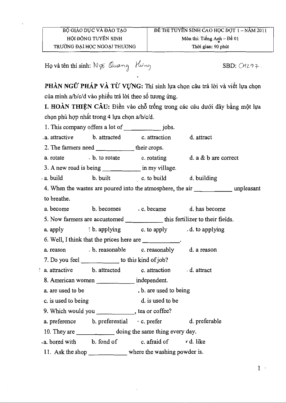 Đề thi cao học đợt 1 năm 2011 môn Tiếng Anh - ĐH Ngoại thương