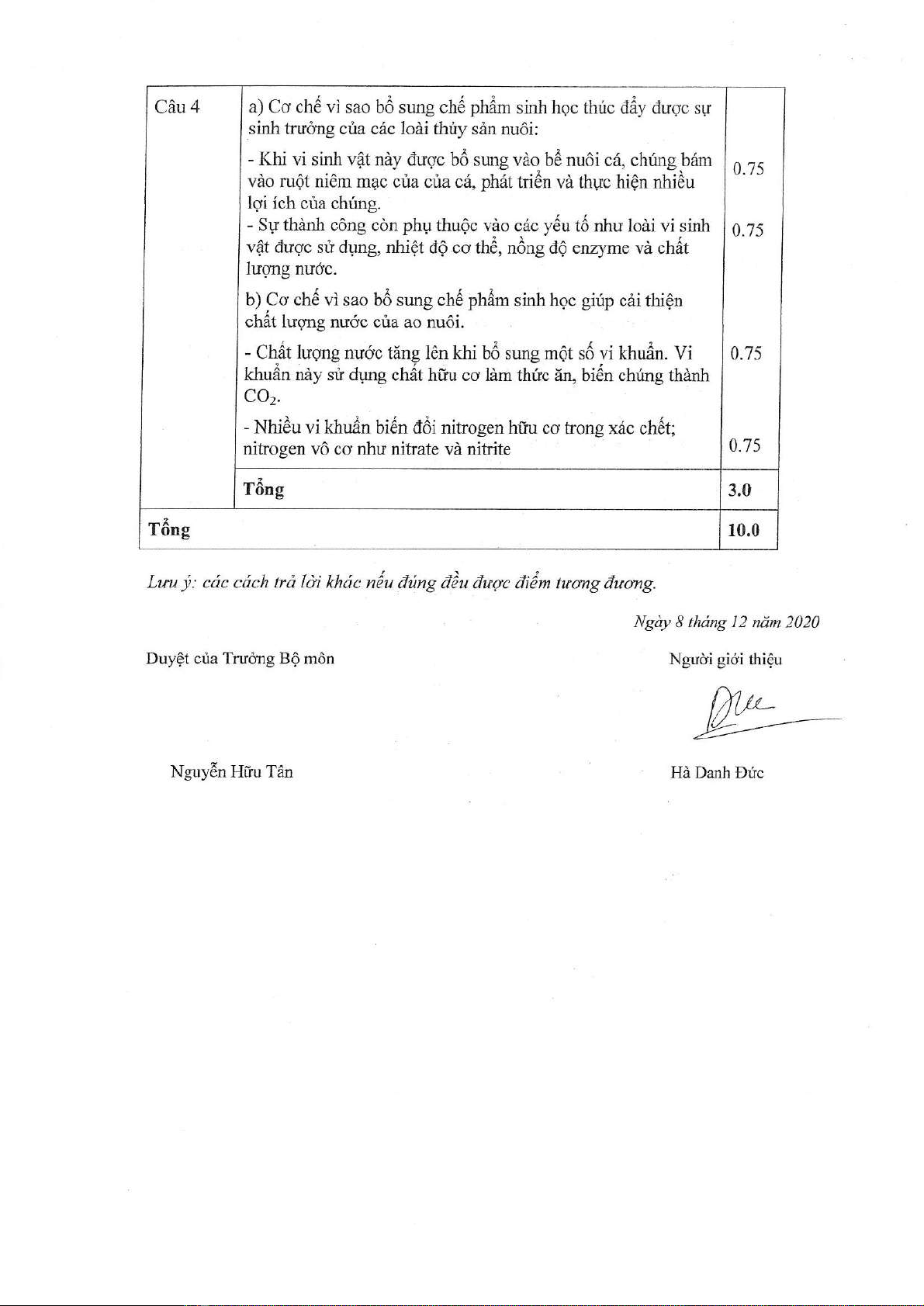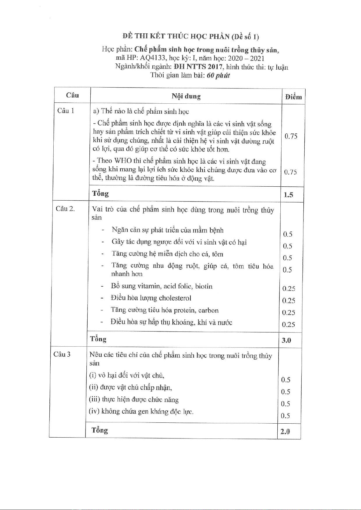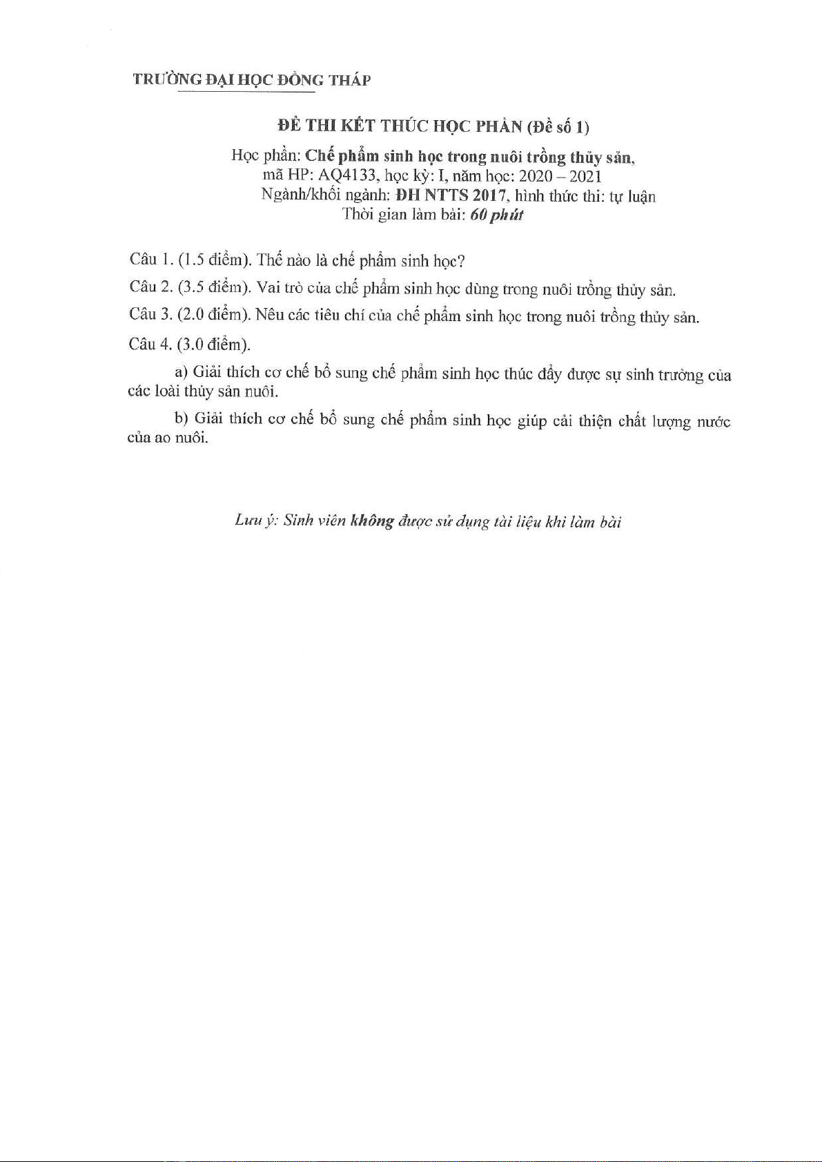 Đề thi kết thúc học phần học kì 1 môn Chế phẩm sinh học trong nuôi trồng thủy sản năm 2020-2021 có đáp án - Trường ĐH Đồng Tháp