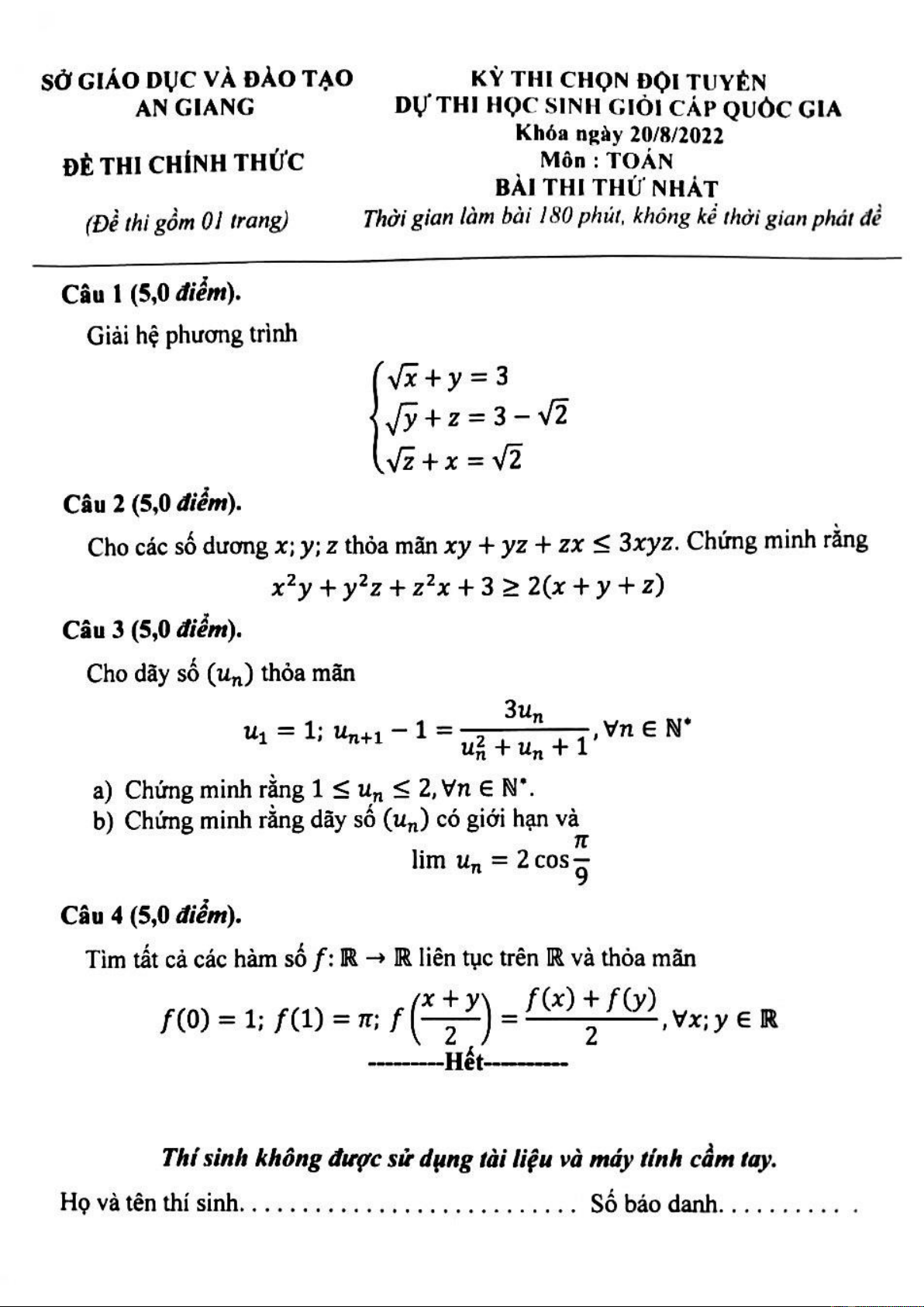 Đề thi chọn đội dự tuyển Quốc gia môn Toán năm 2022 - Sở GD&ĐT An Giang