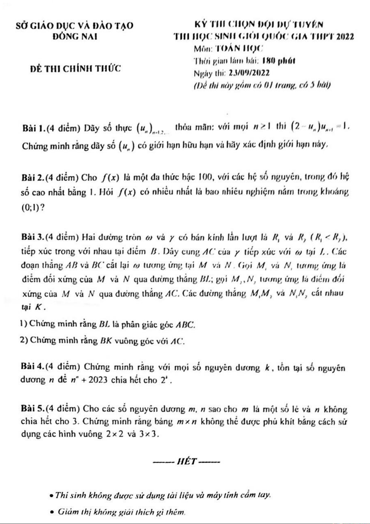 Đề thi chọn học sinh giỏi Quốc gia môn Toán năm 2022 - Sở GD&ĐT Đồng Nai