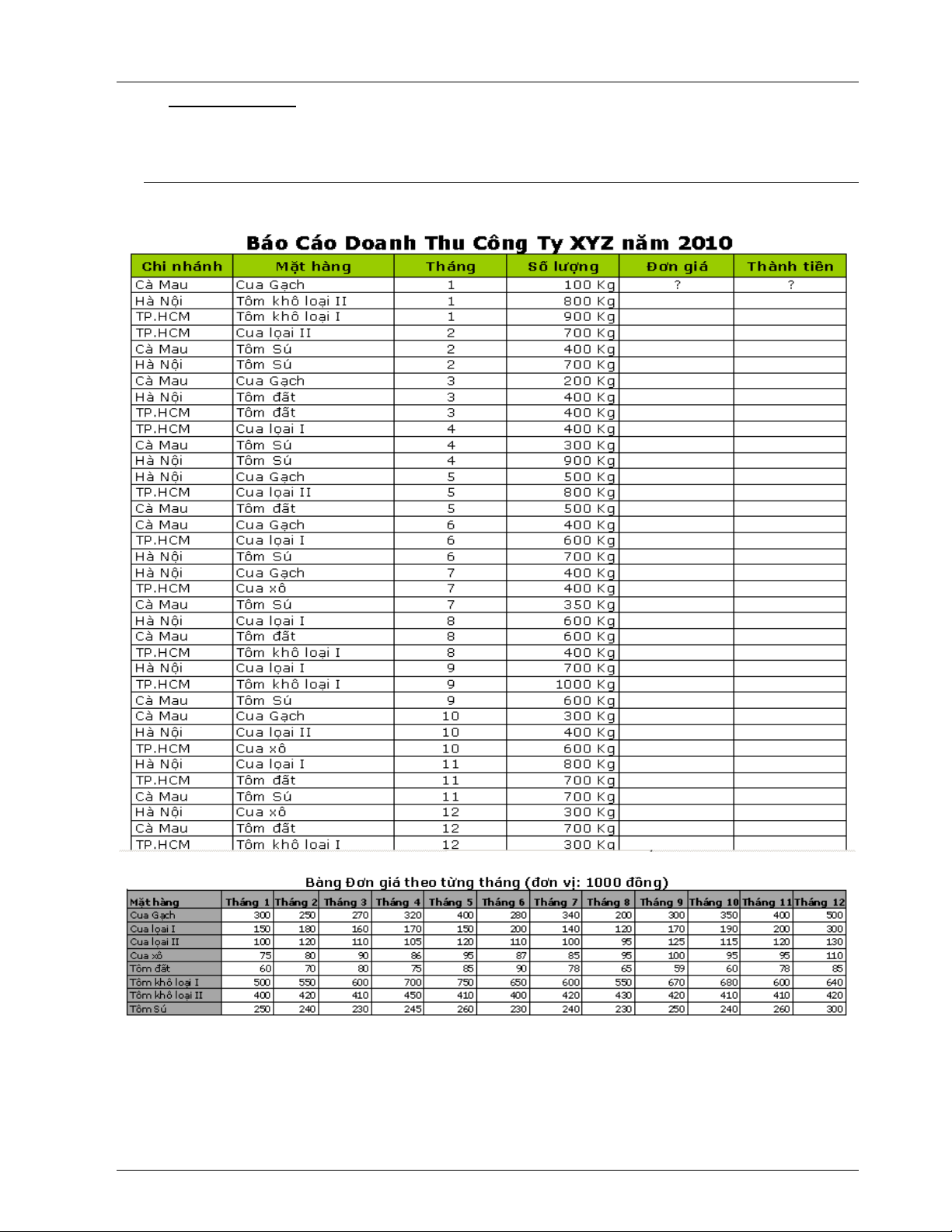 Yêu cầu: Từ dữ liệu đã được cung cấp, trình bày bảng tính theo yêu cầu: