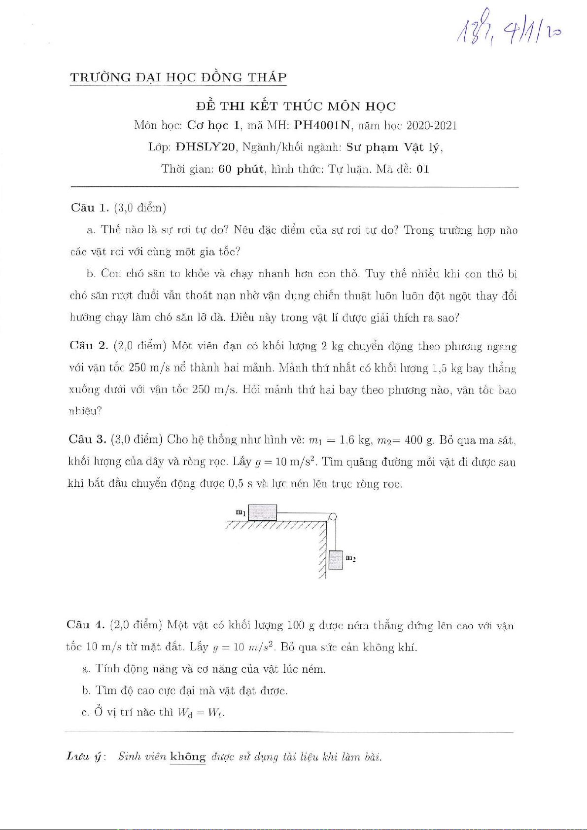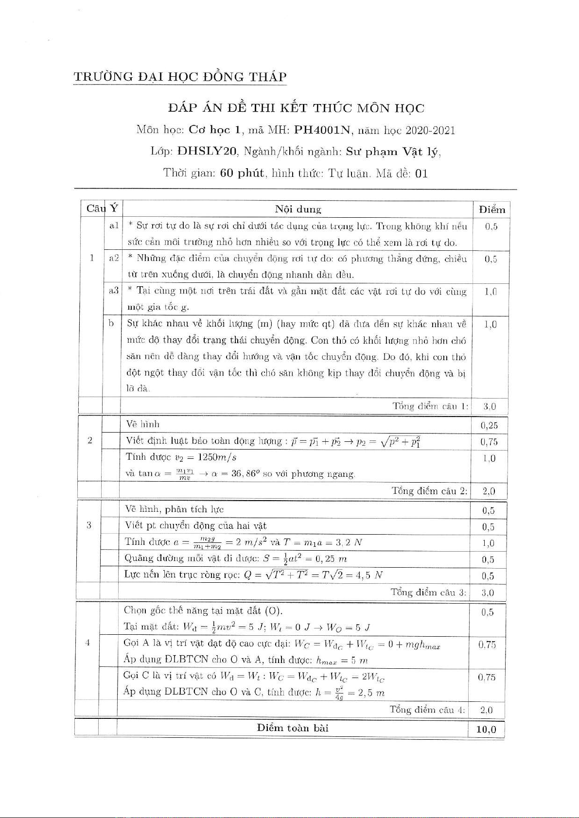 Đề thi kết thúc học phần học kì 1 môn Cơ học 1 năm 2020-2021 có đáp án - Trường ĐH Đồng Tháp