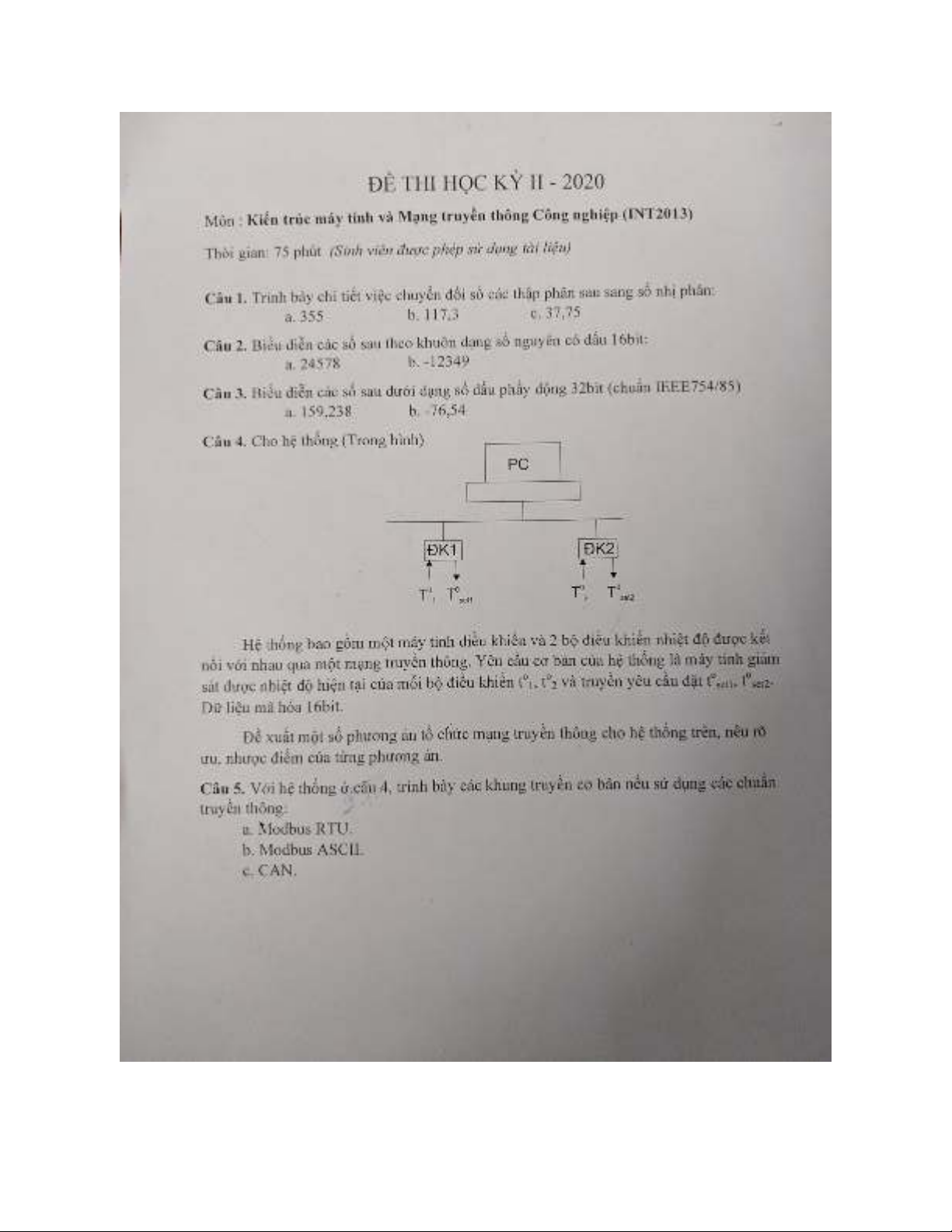 Đề thi cuối học kỳ II năm học 2019-2020 môn Kiến trúc mạng máy tính và mạng truyền thông công nghiệp giúp các bạn học sinh có thêm tài liệu ôn tập, luyện tập nhằm nắm vững được những kiến thức, kĩ năng cơ bản, đồng thời vận dụng kiến thức để giải các bài tập một cách thuận lợi.