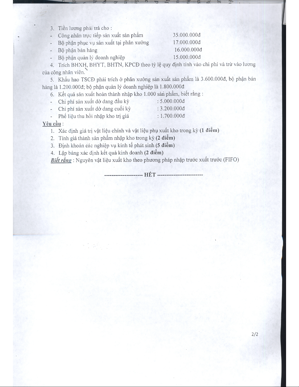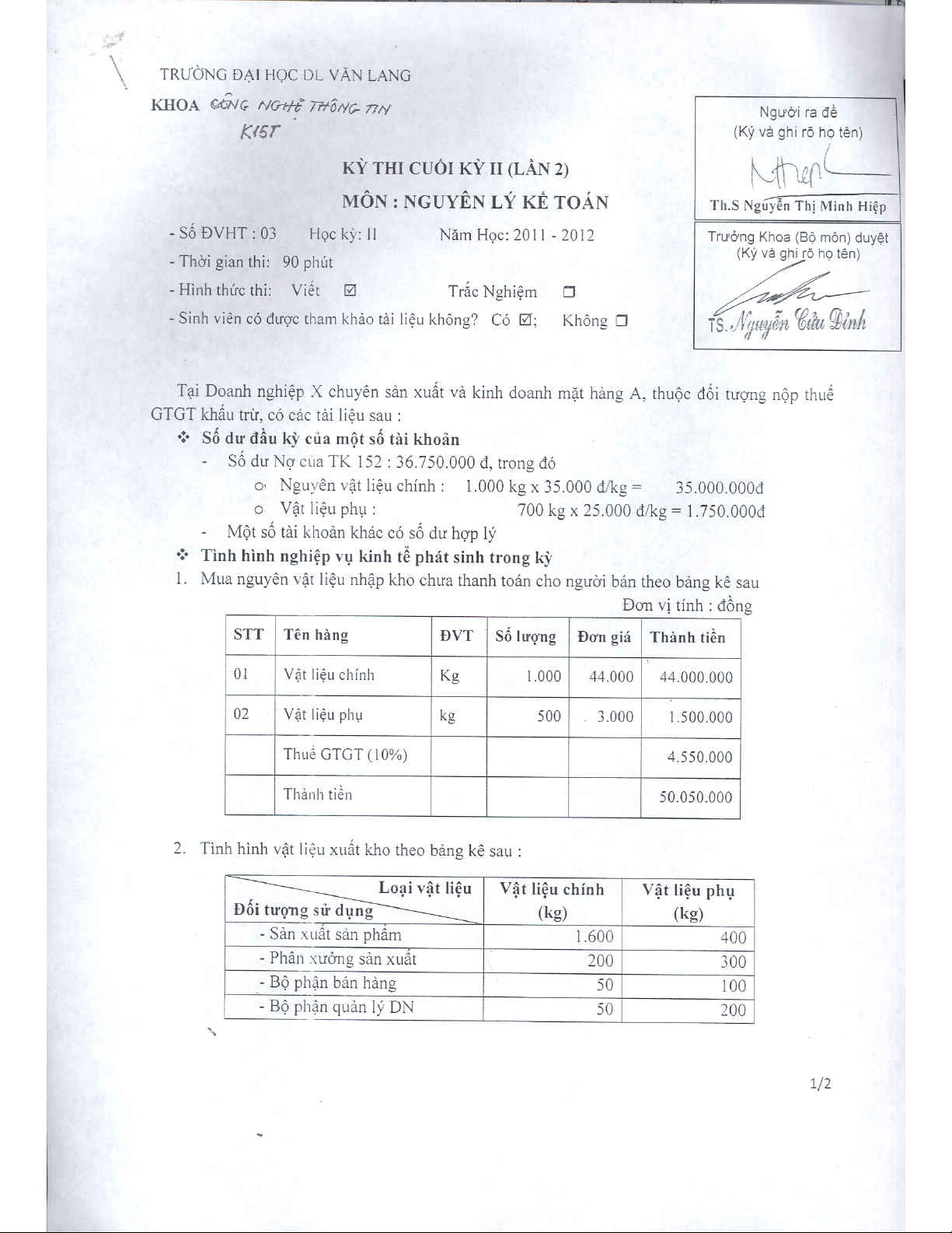 Đề thi cuối học kỳ 2 môn Nguyên lý kế toán - ĐH Dân Lập Văn Lang