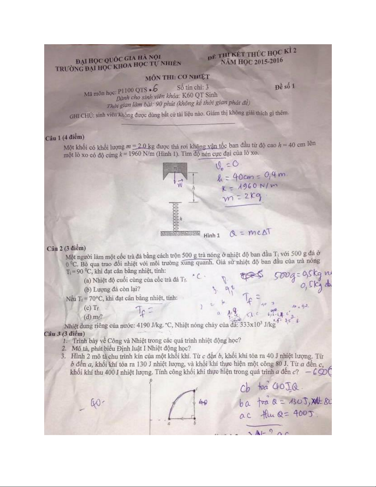 Đề thi cuối học kỳ 2 năm học 2015-2016 môn học Cơ nhiệt – ĐH Khoa học Tự nhiên