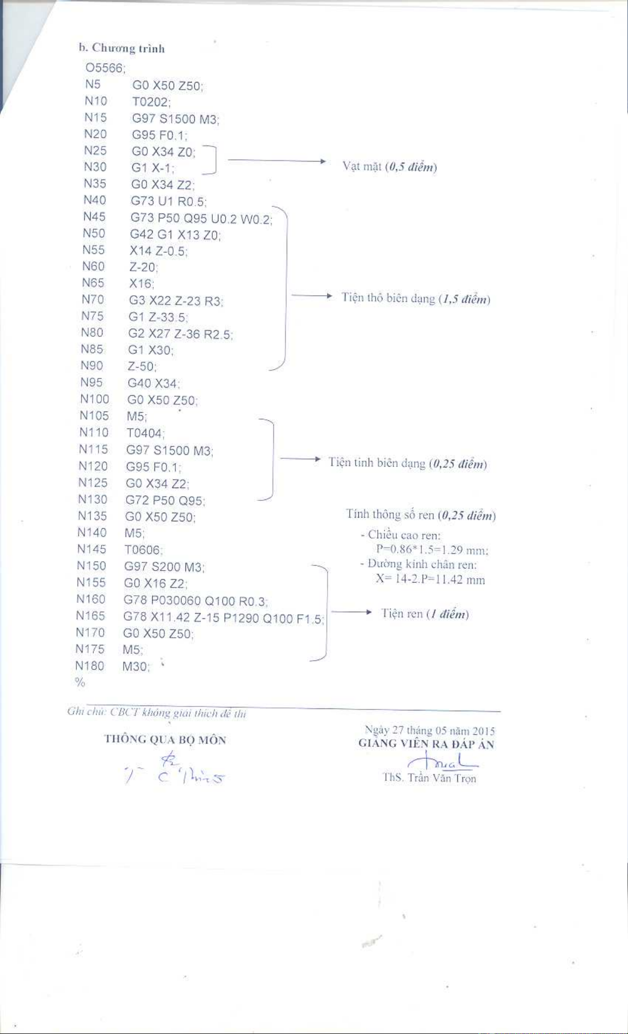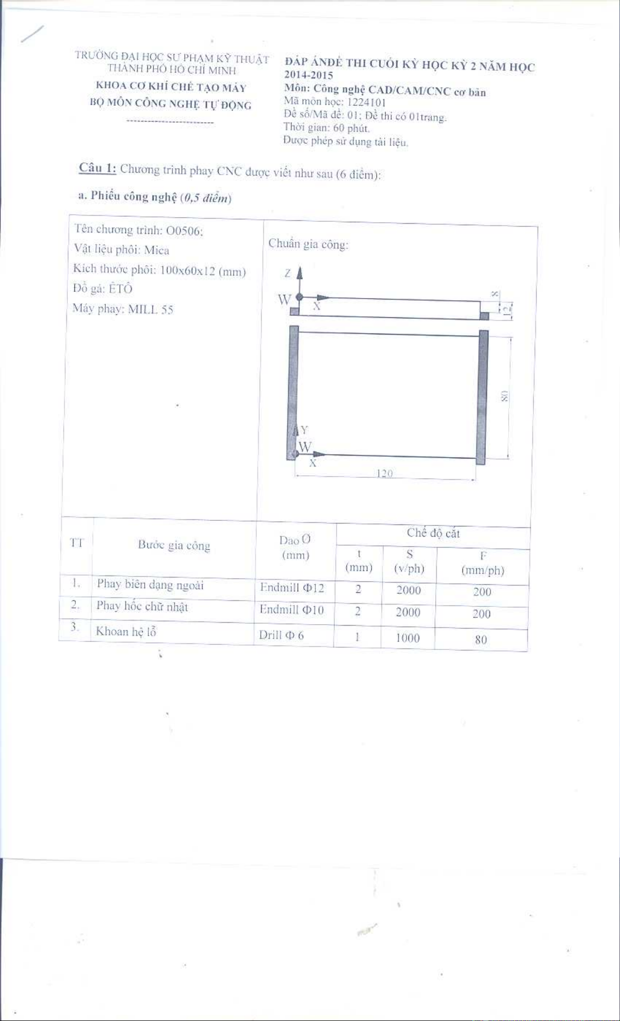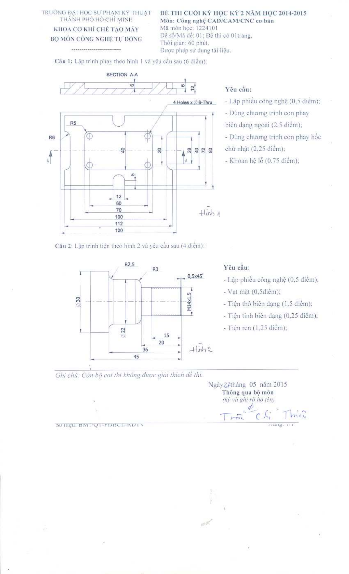 Đề thi cuối học kỳ II năm học 2014-2015 môn Công nghệ CAD/CAM/CNC cơ bản (Mã đề 01) - ĐH Sư phạm Kỹ thuật