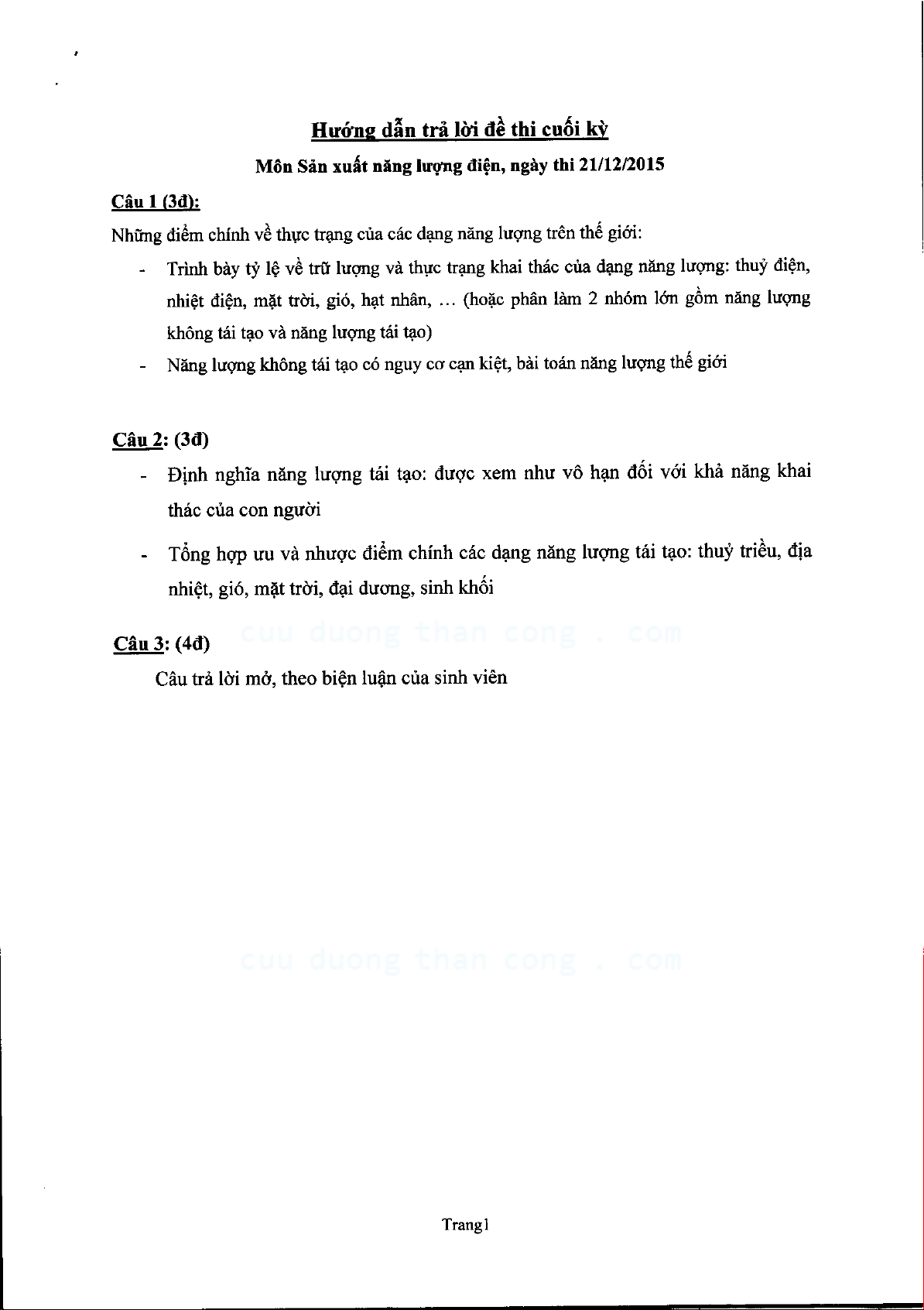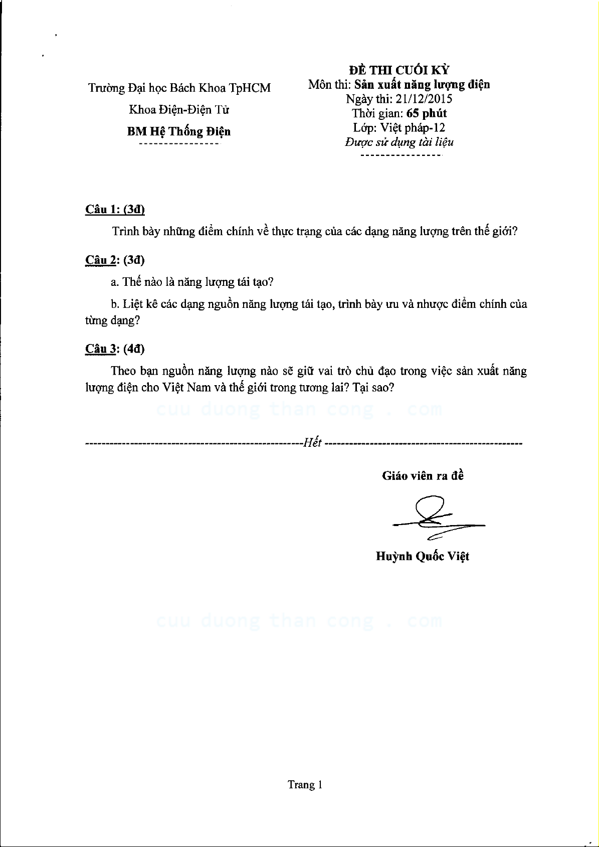 Đề thi cuối học kỳ môn Sản xuất năng lượng điện
