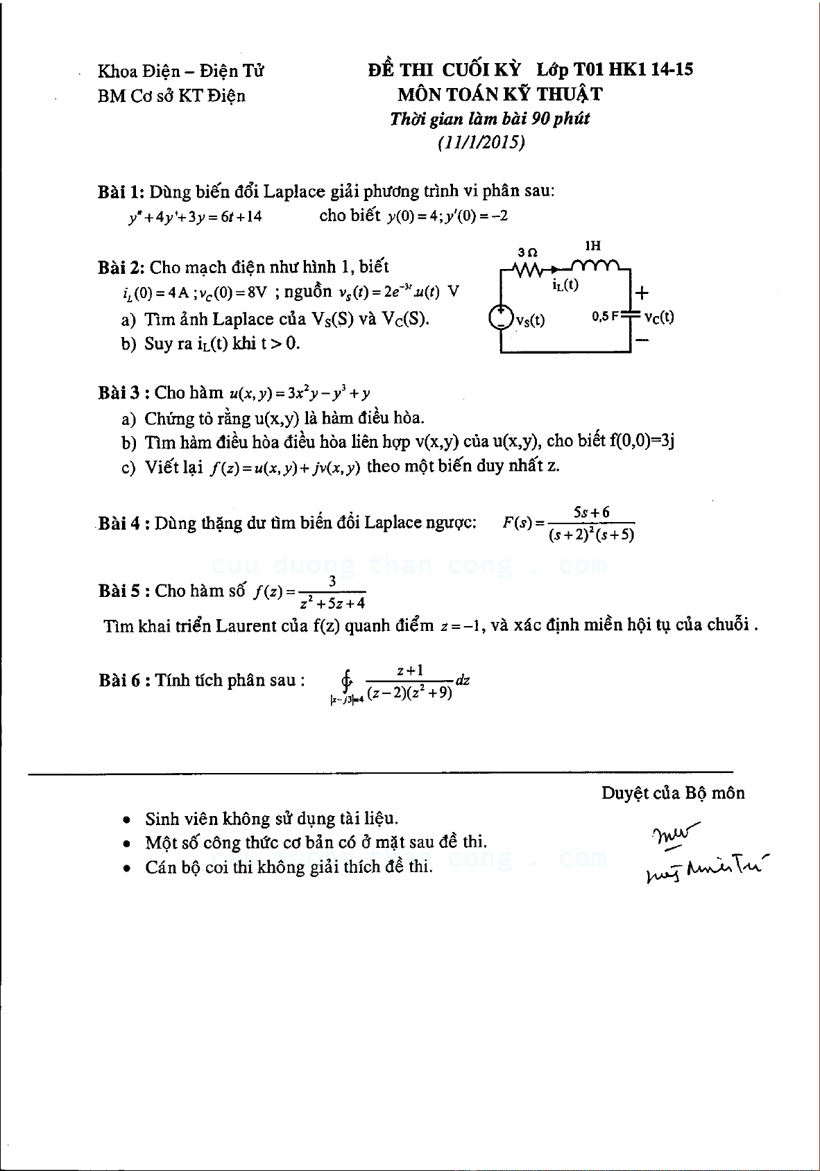 Đề thi cuối học kỳ môn Toán kỹ thuật
