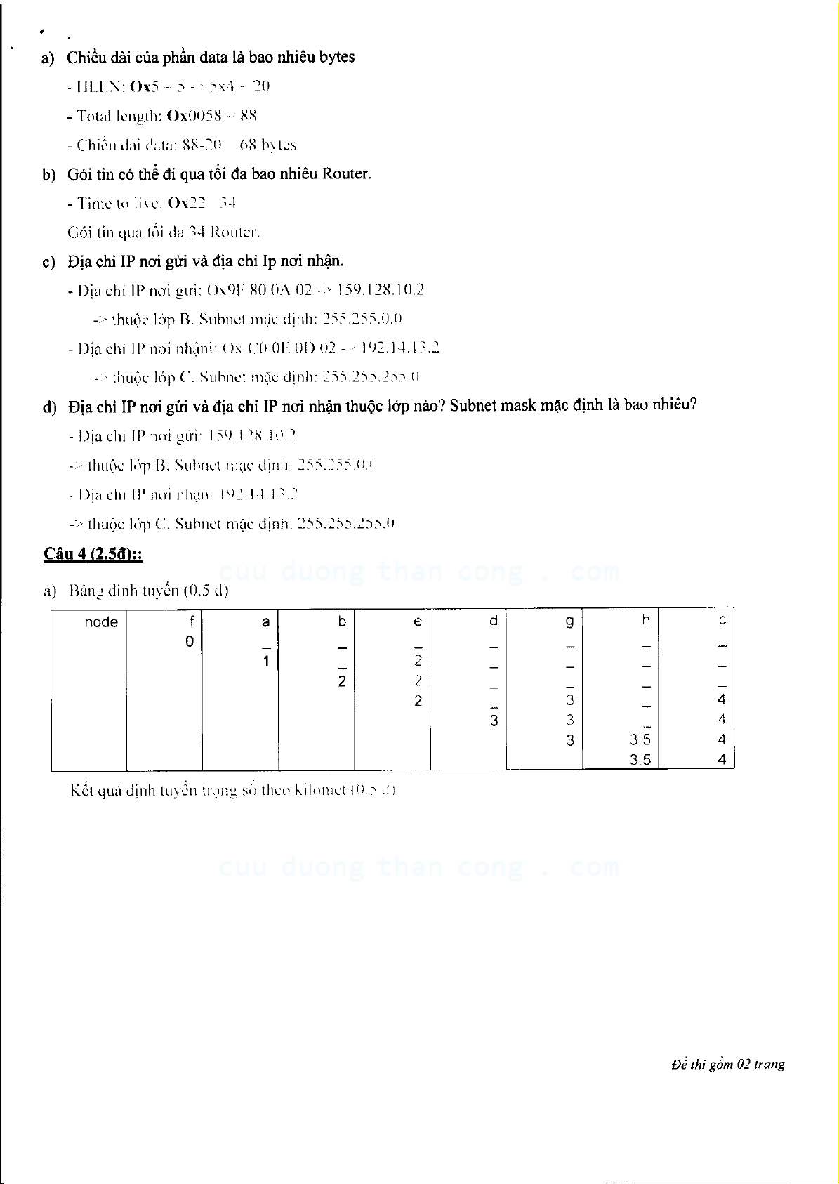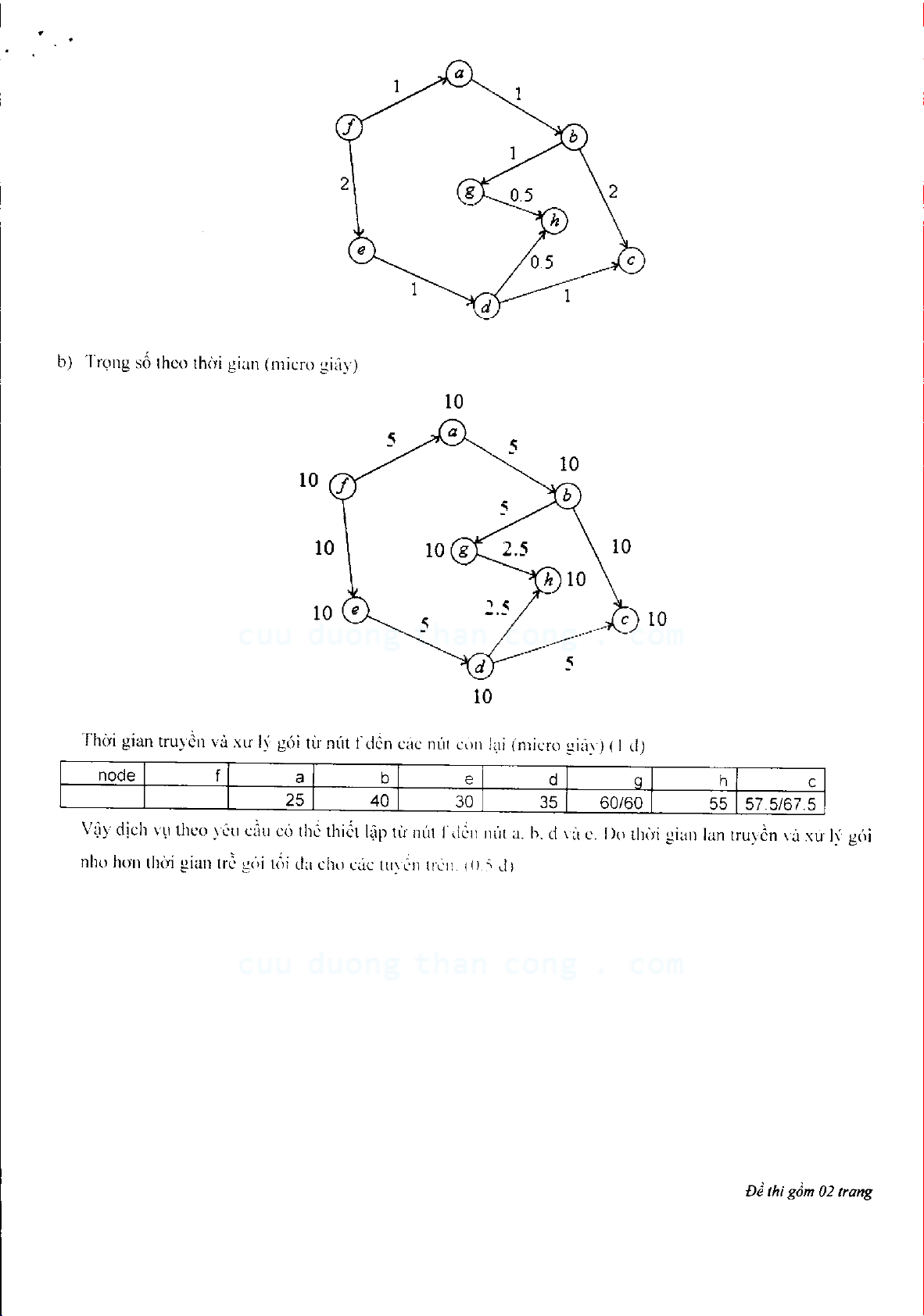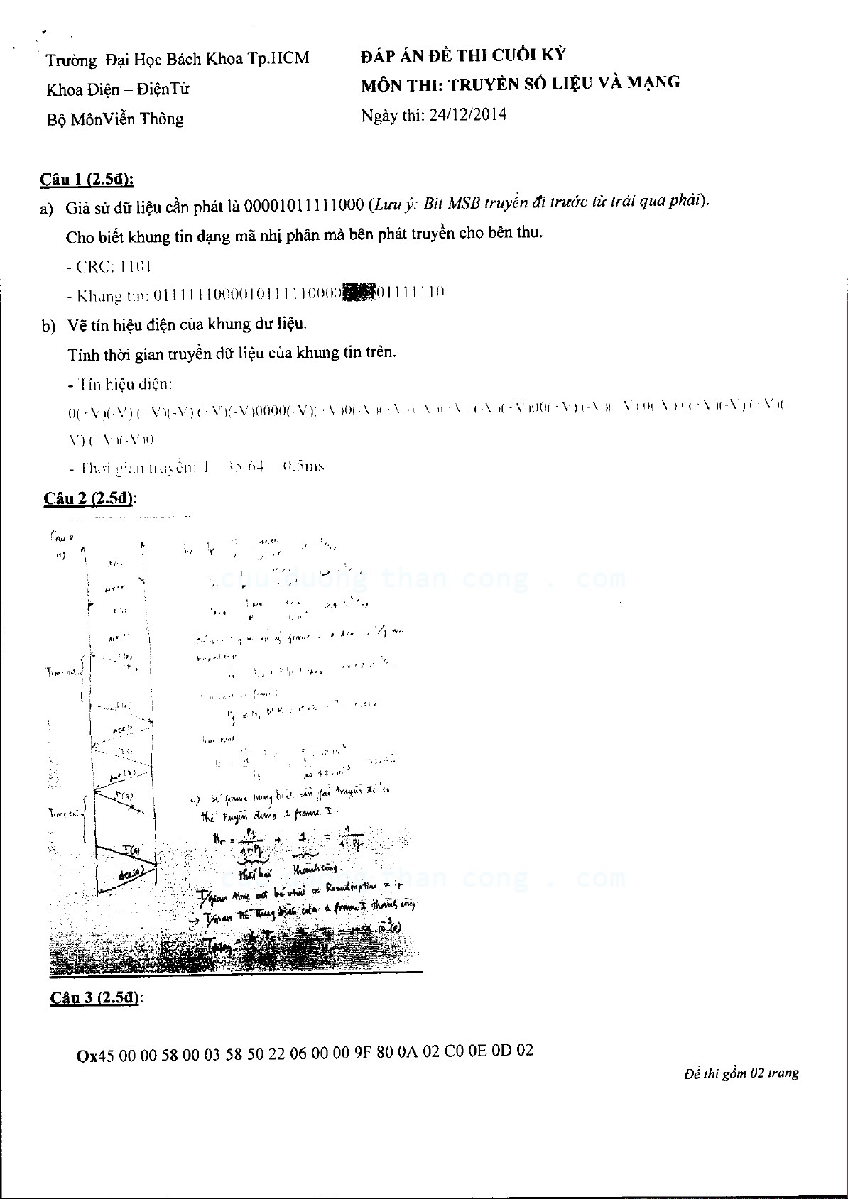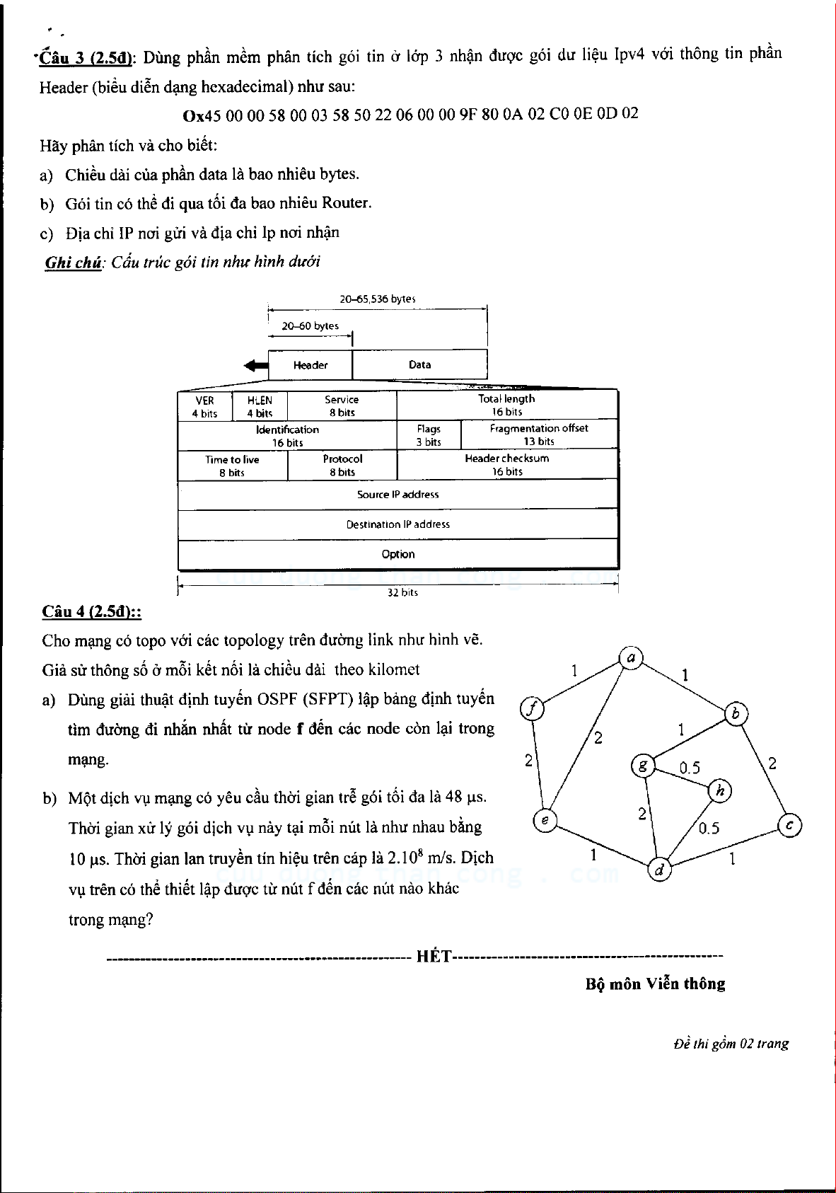 Đề thi cuối kỳ môn Truyền số liệu và mạng