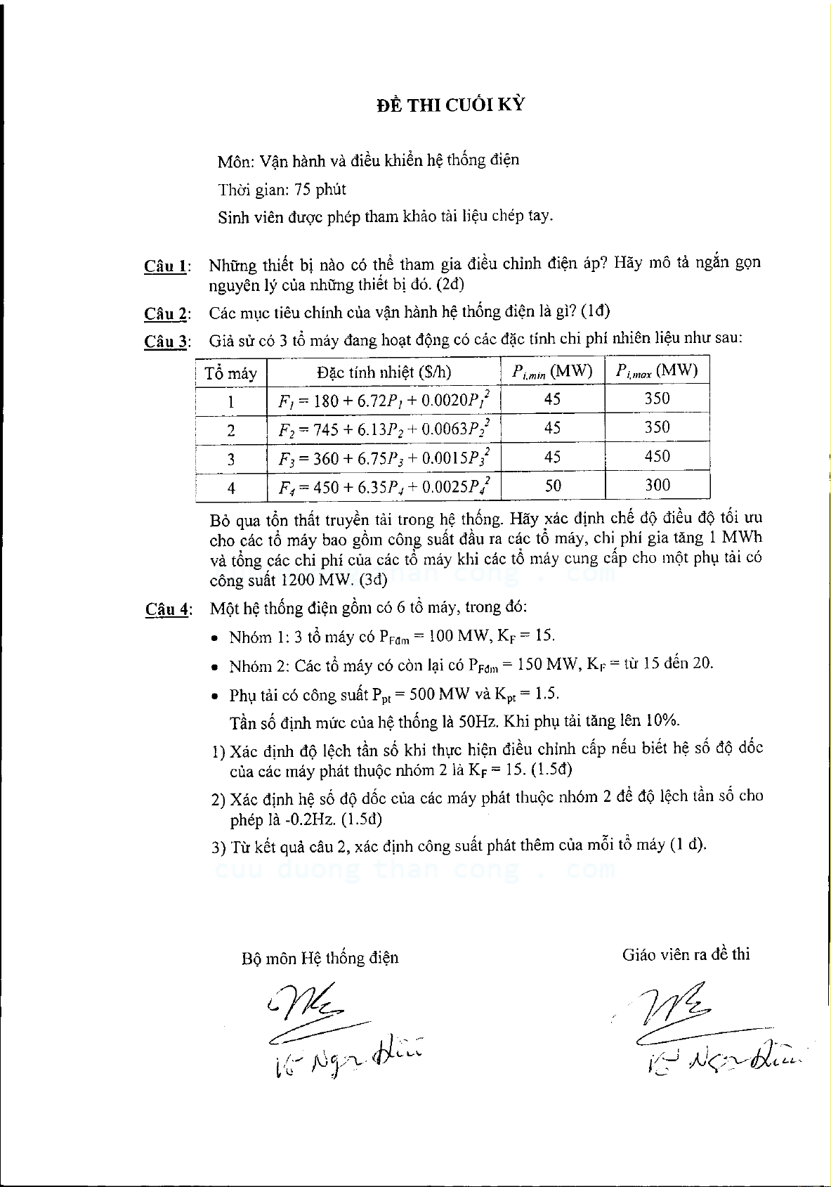 Đề thi cuối kỳ môn Vận hành và điều khiển hệ thống điện - Năm học 2014-2015