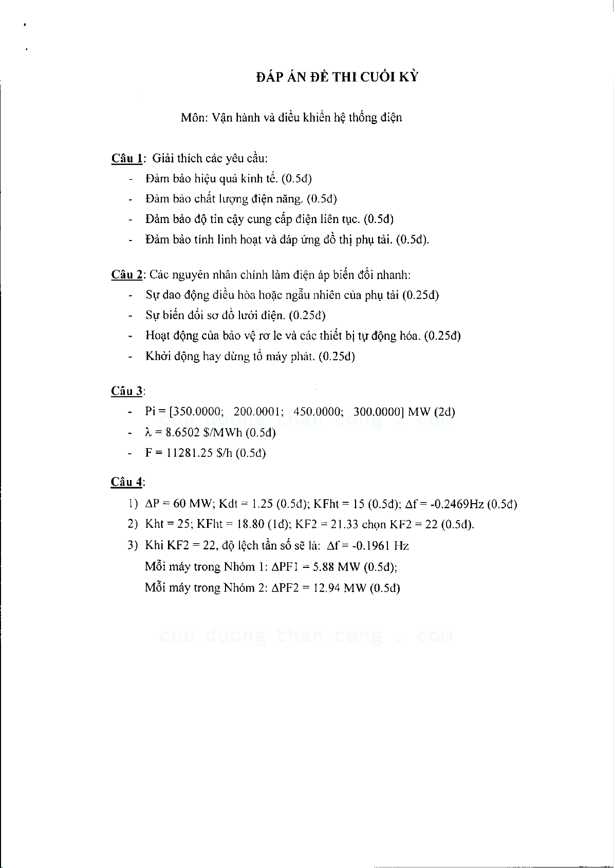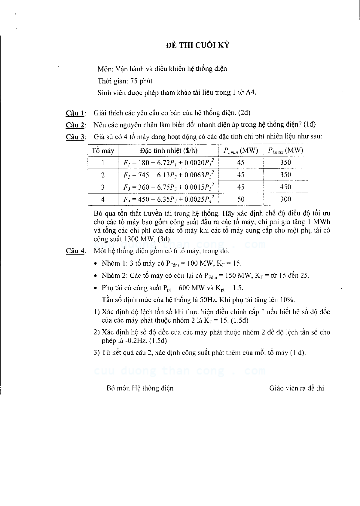 Đề thi cuối kỳ môn Vận hành và điều khiển hệ thống điện