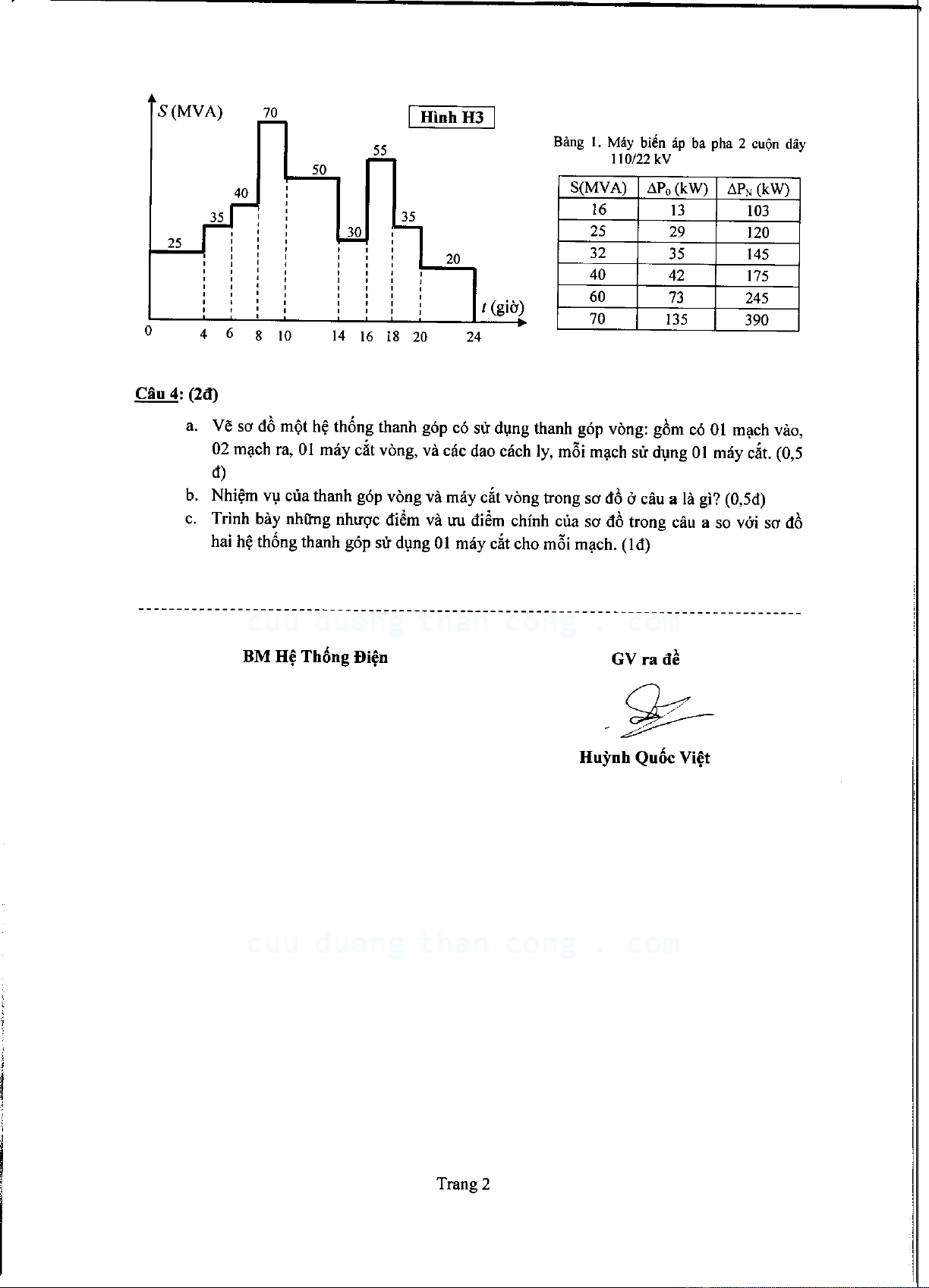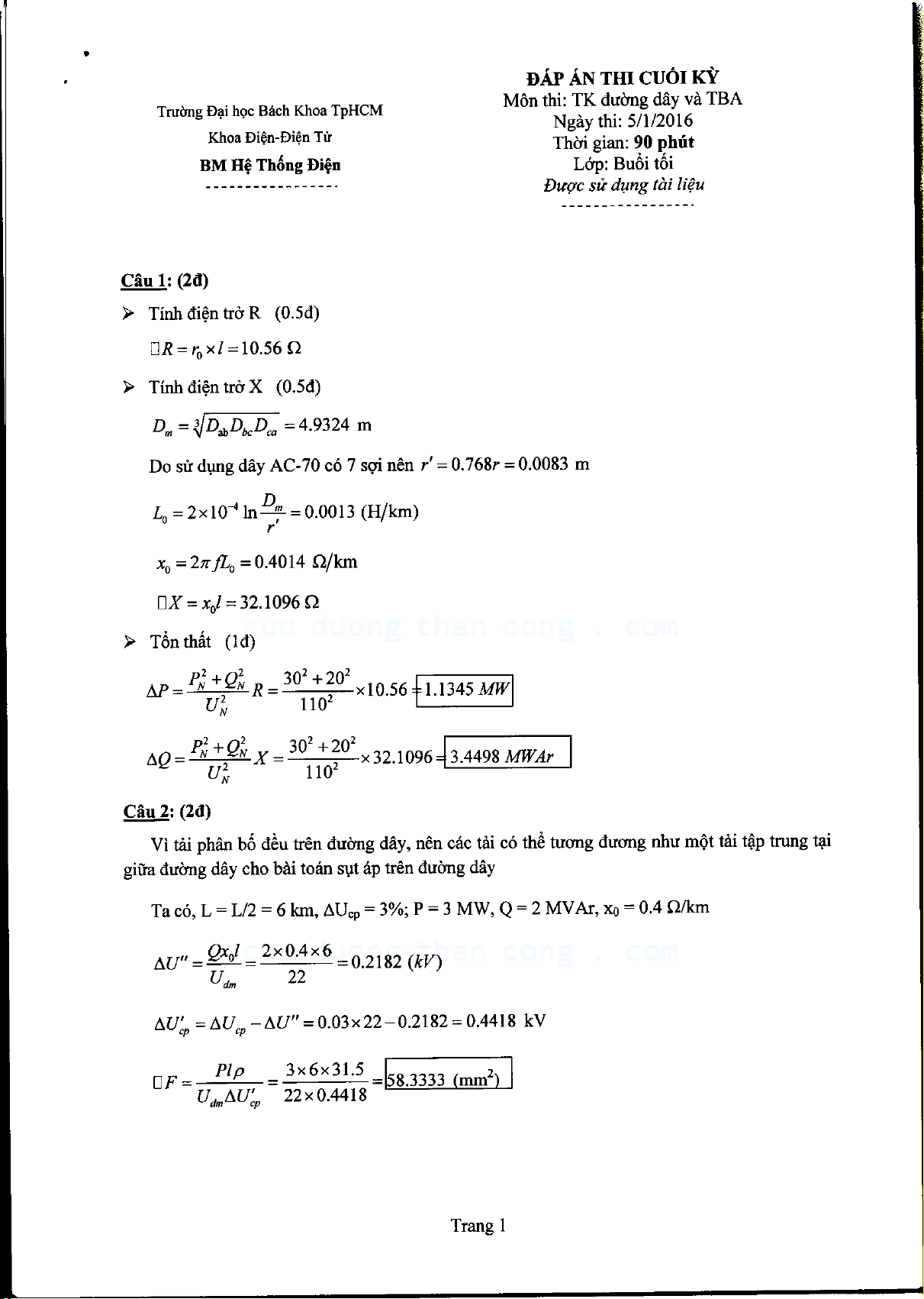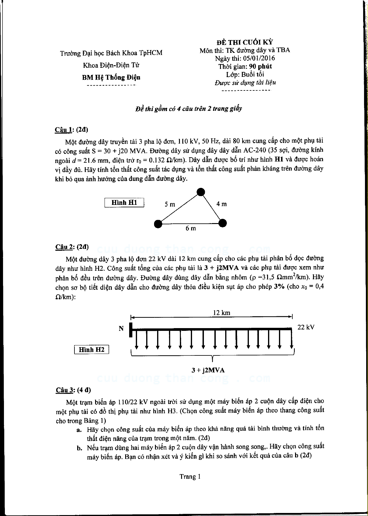 Đề thi cuối kỳ môn Thiết kế đường dây và trạm biến áp - Năm học 2015 - 2016