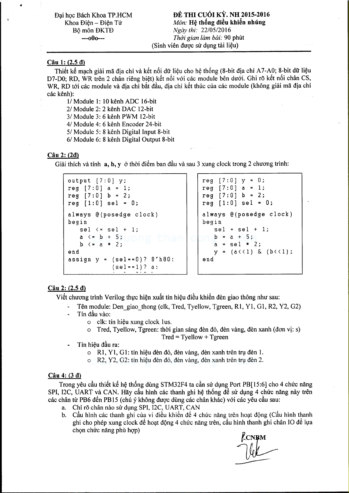 Đề thi cuối học kỳ 2 năm học 2015 - 2016 môn Thiết kế hệ thống nhúng - Lớp chính quy VP10NL