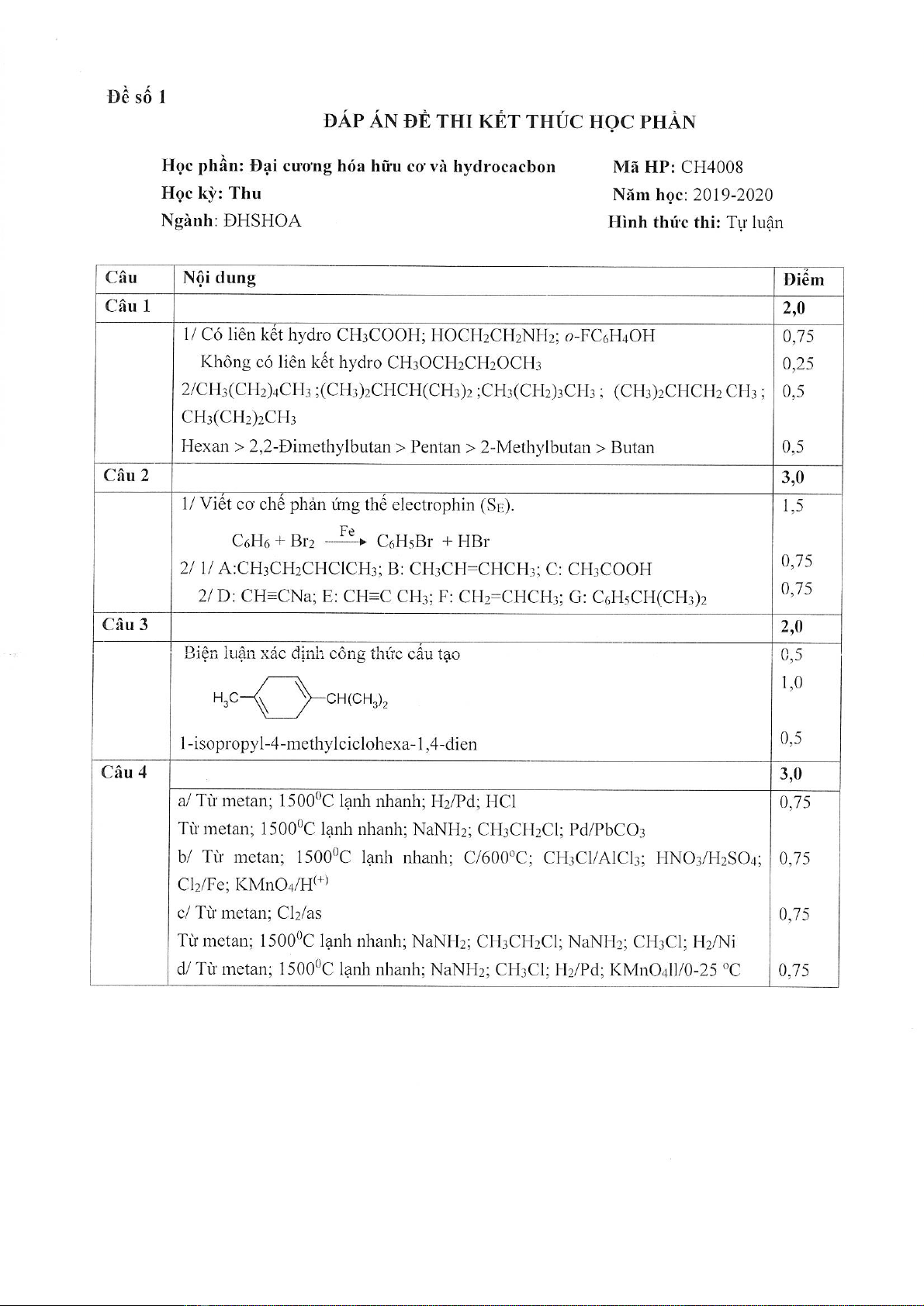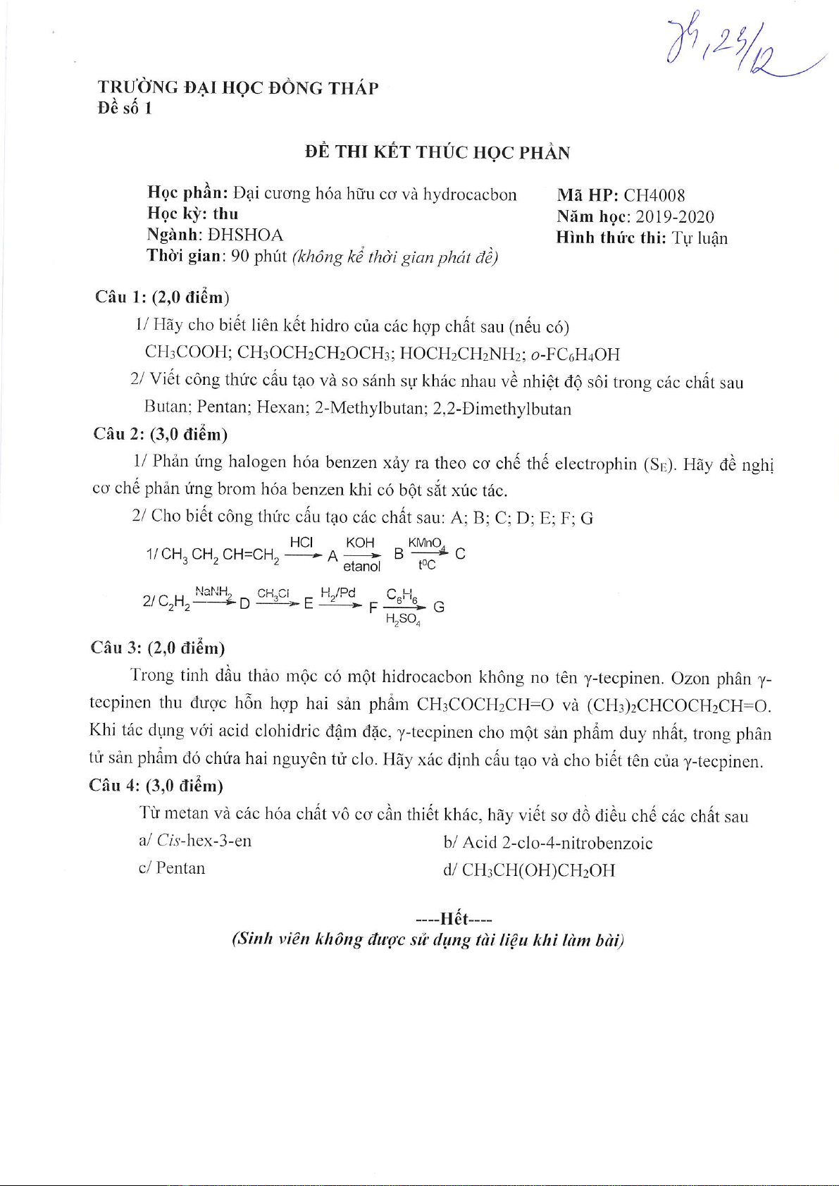 Đề thi kết thúc học phần học kì 1 môn Đại cương hóa hữu cơ và hydrocacbon năm 2019-2020 có đáp án - Trường ĐH Đồng Tháp