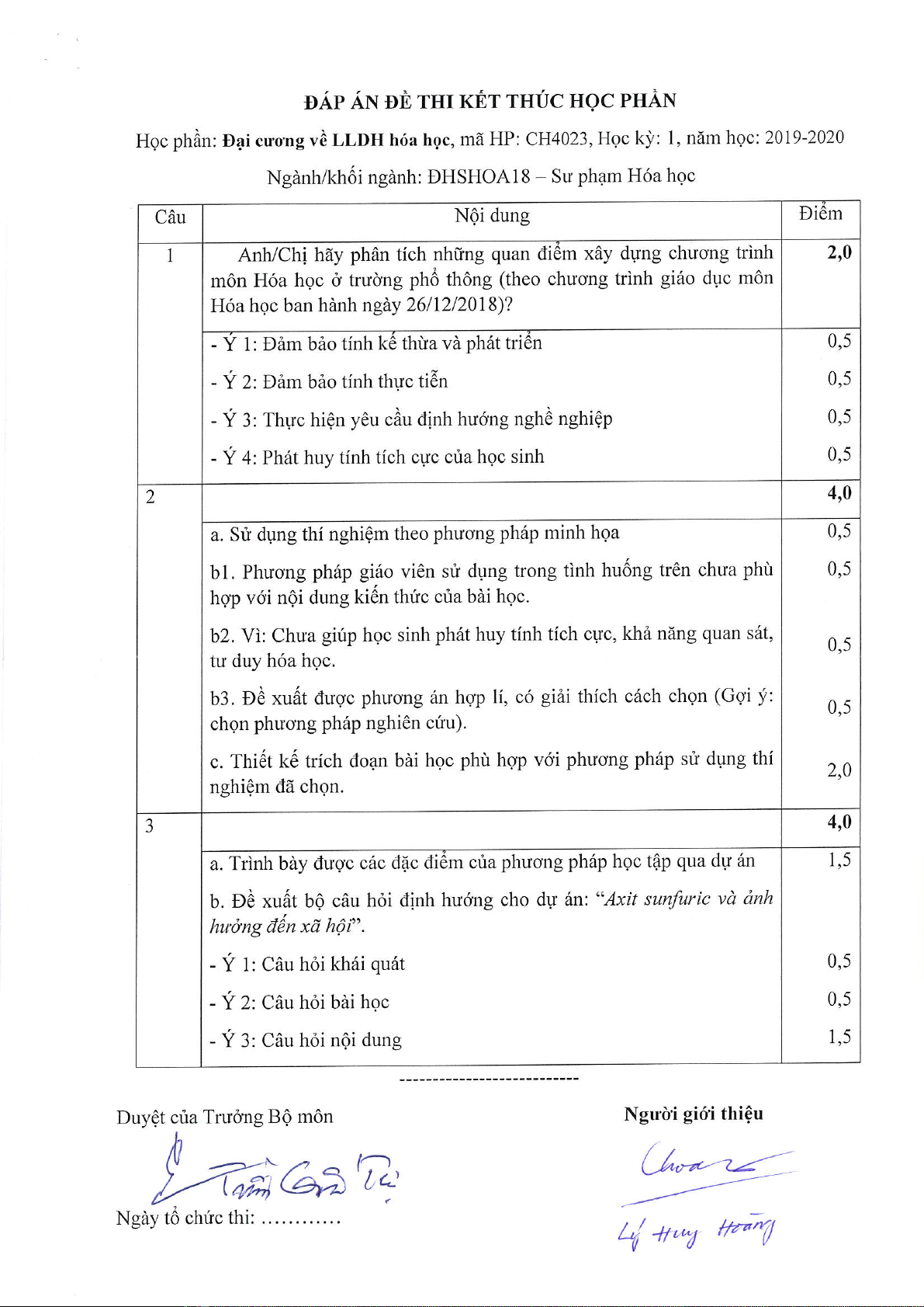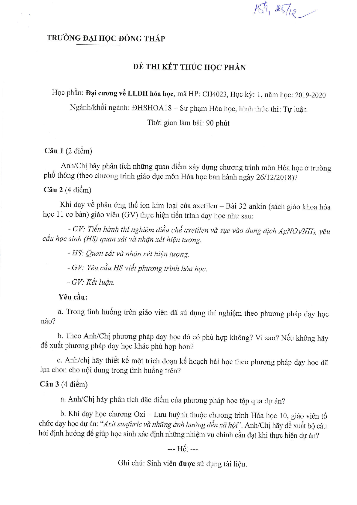 Đề thi kết thúc học phần học kì 1 môn Đại cương về lý luận dạy học hóa học năm 2019-2020 có đáp án - Trường ĐH Đồng Tháp
