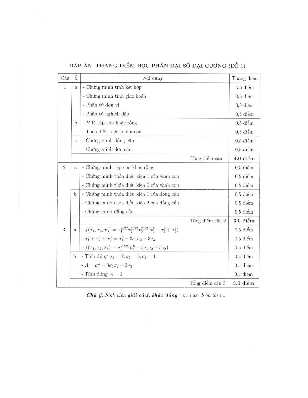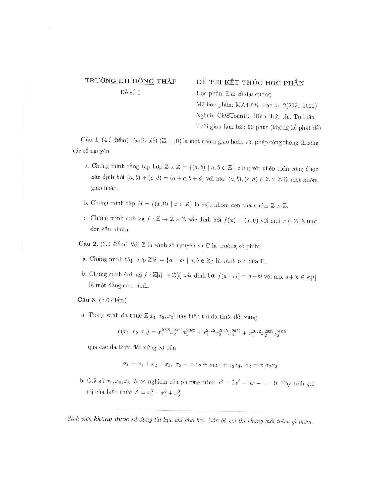 Đề thi kết thúc học phần học kì 2 môn Đại số đại cương năm 2021-2022 có đáp án - Trường ĐH Đồng Tháp