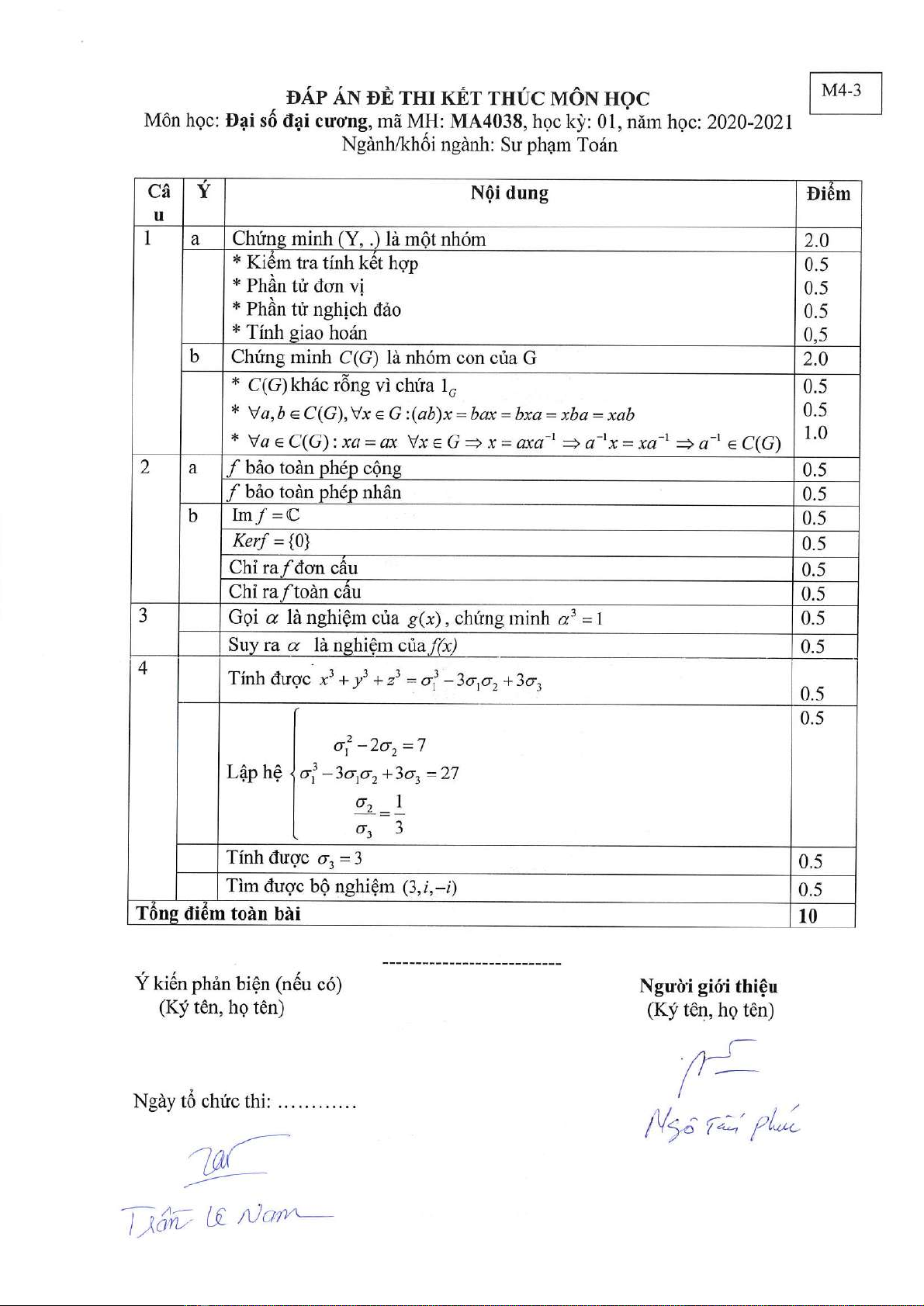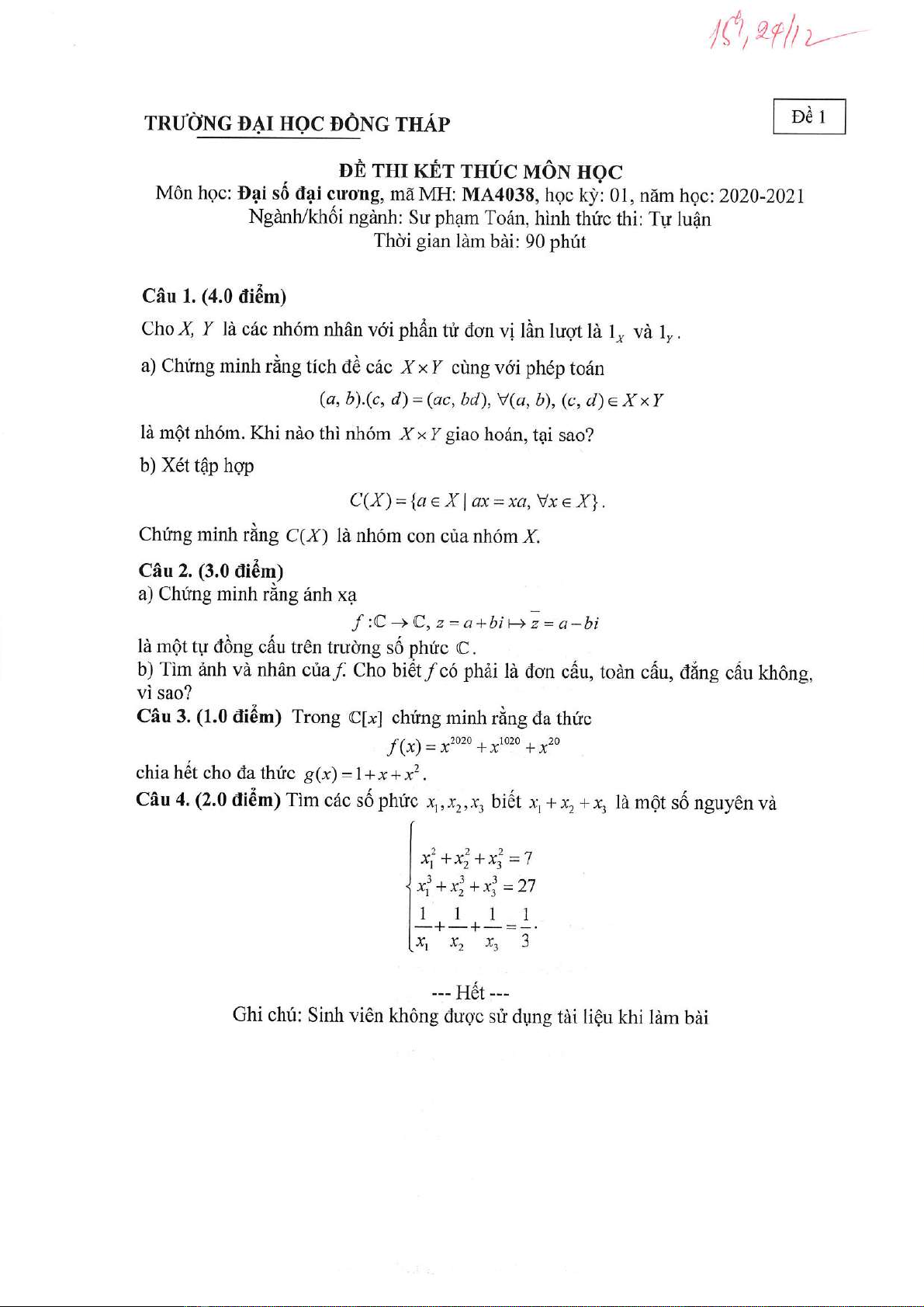 Đề thi kết thúc học phần học kì 1 môn Đại số đại cương năm 2020-2021 có đáp án - Trường ĐH Đồng Tháp