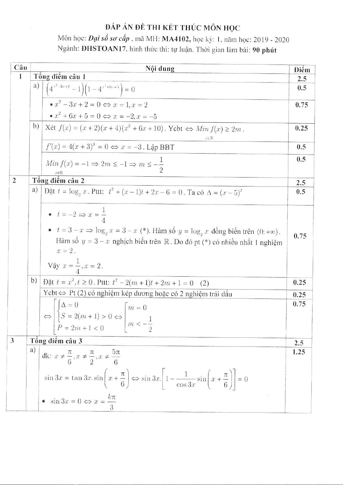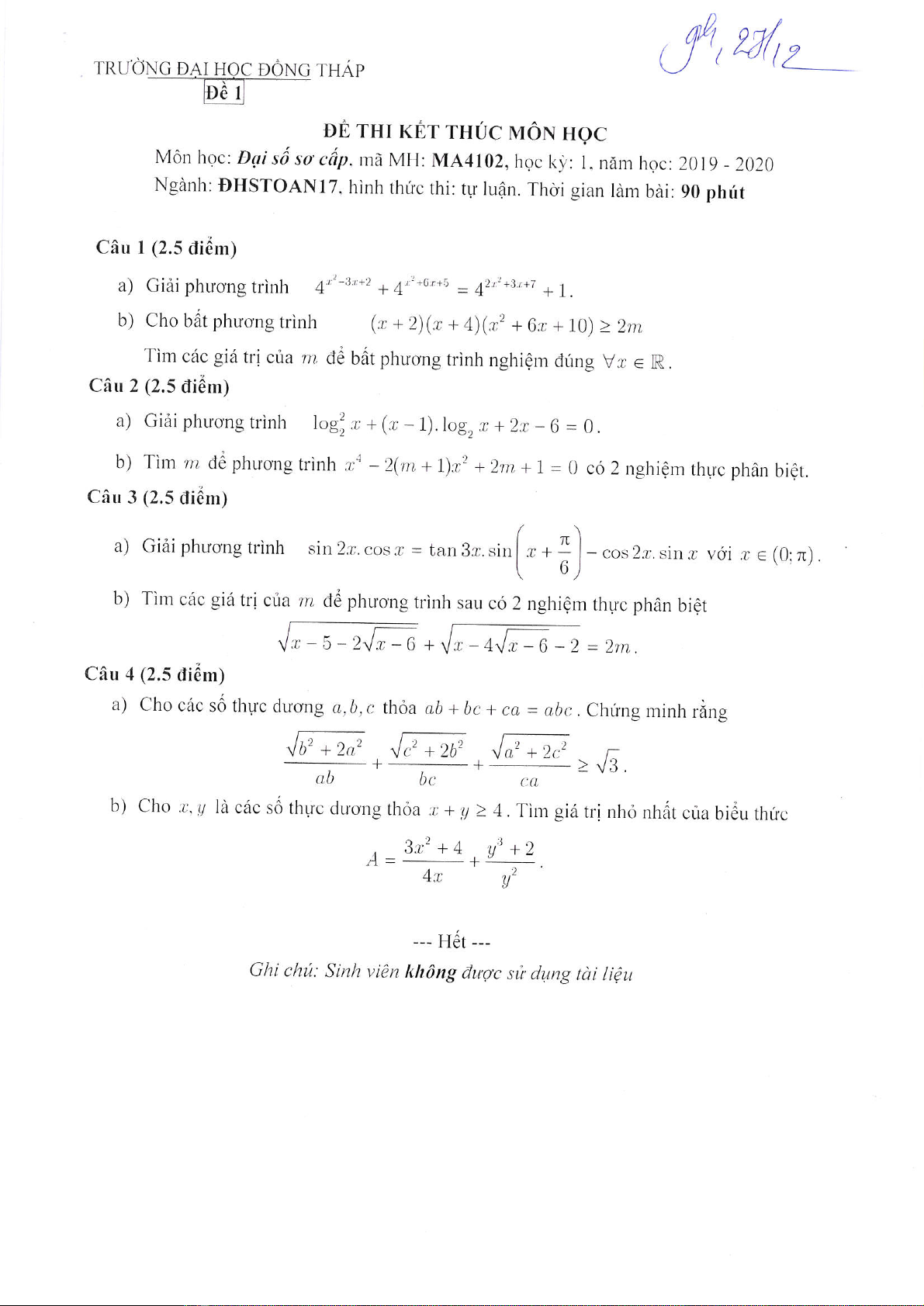 Đề thi kết thúc học phần học kì 1 môn Đại số sơ cấp năm 2019-2020 có đáp án - Trường ĐH Đồng Tháp