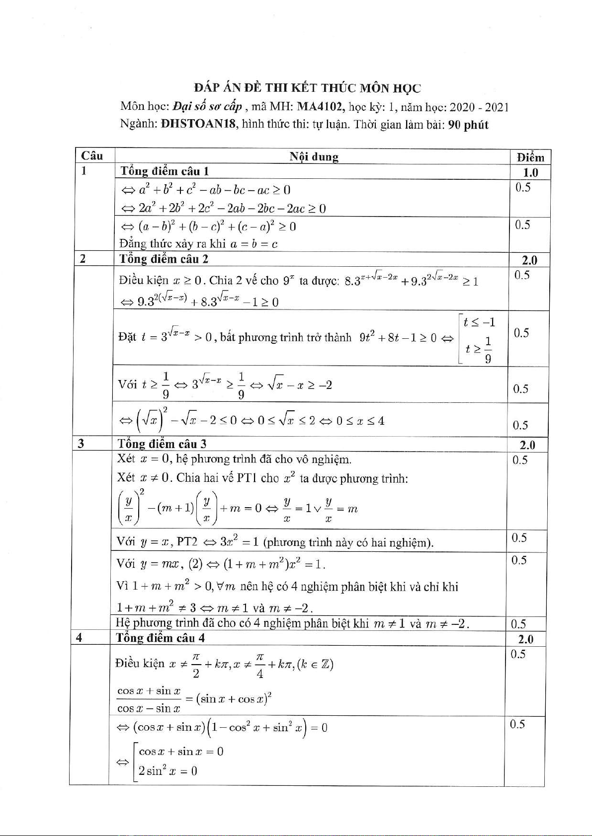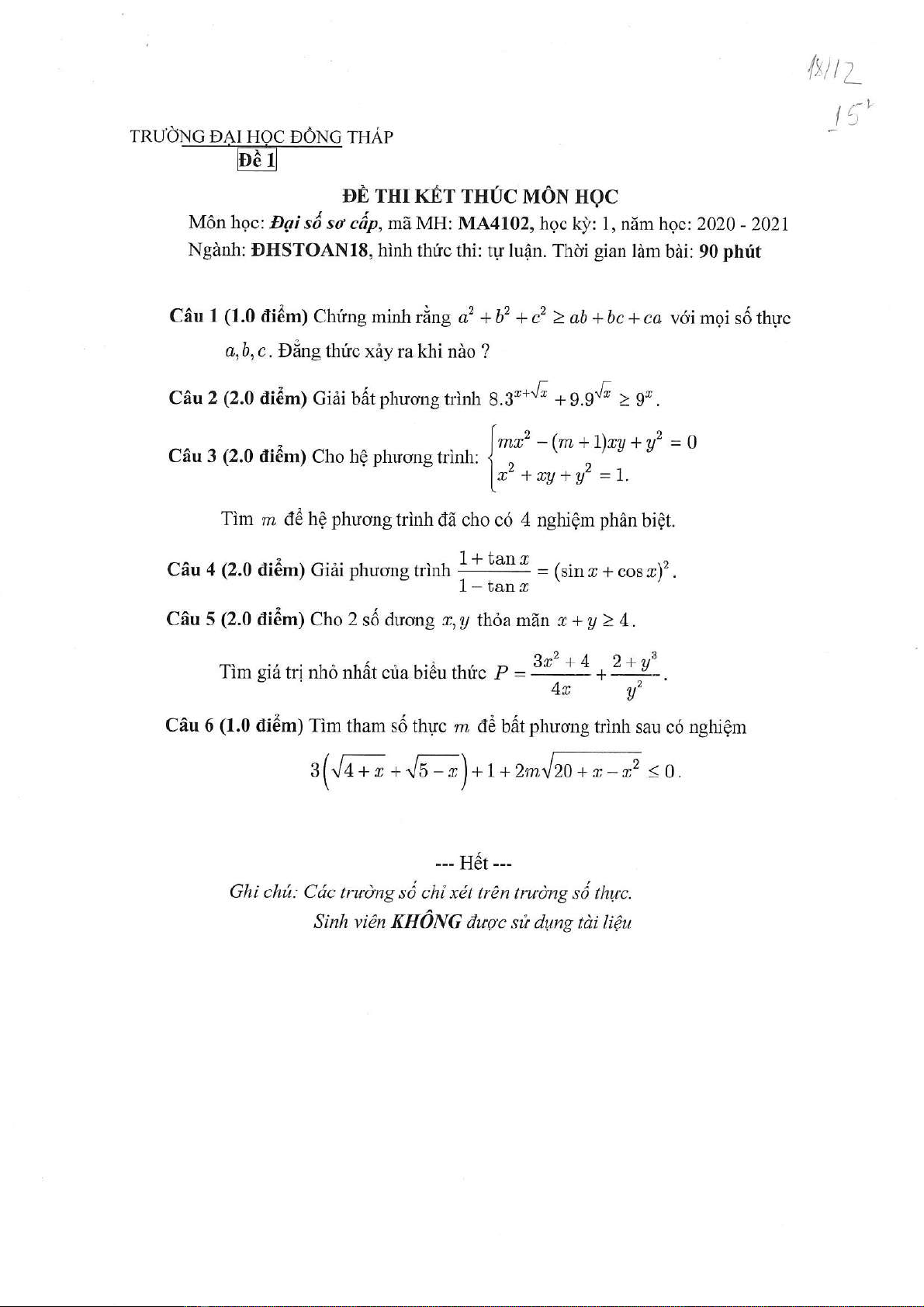 Đề thi kết thúc học phần học kì 1 môn Đại số sơ cấp năm 2020-2021 có đáp án - Trường ĐH Đồng Tháp