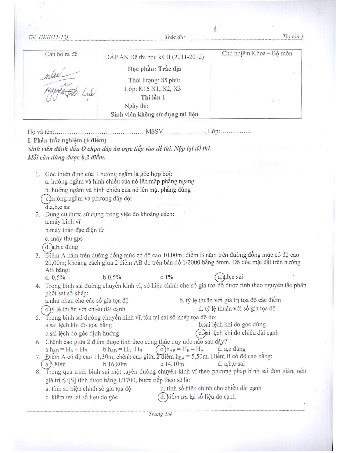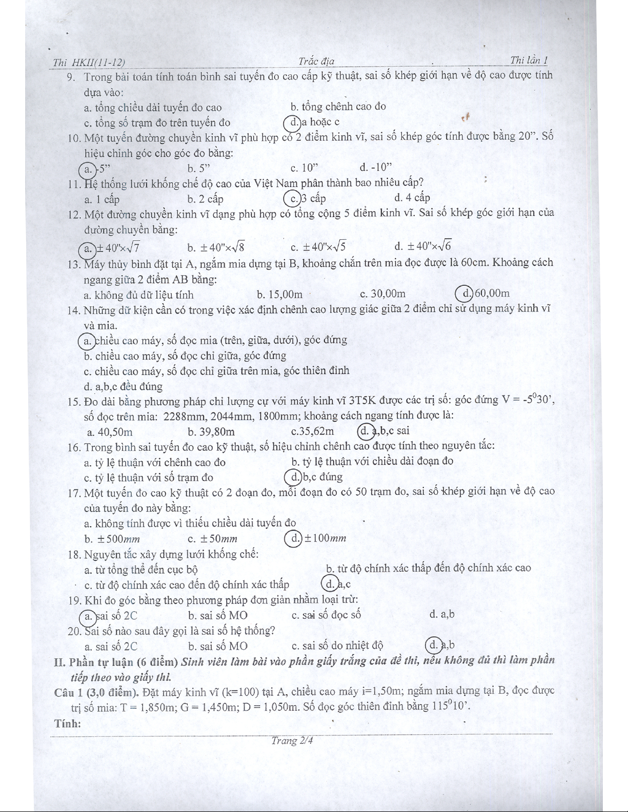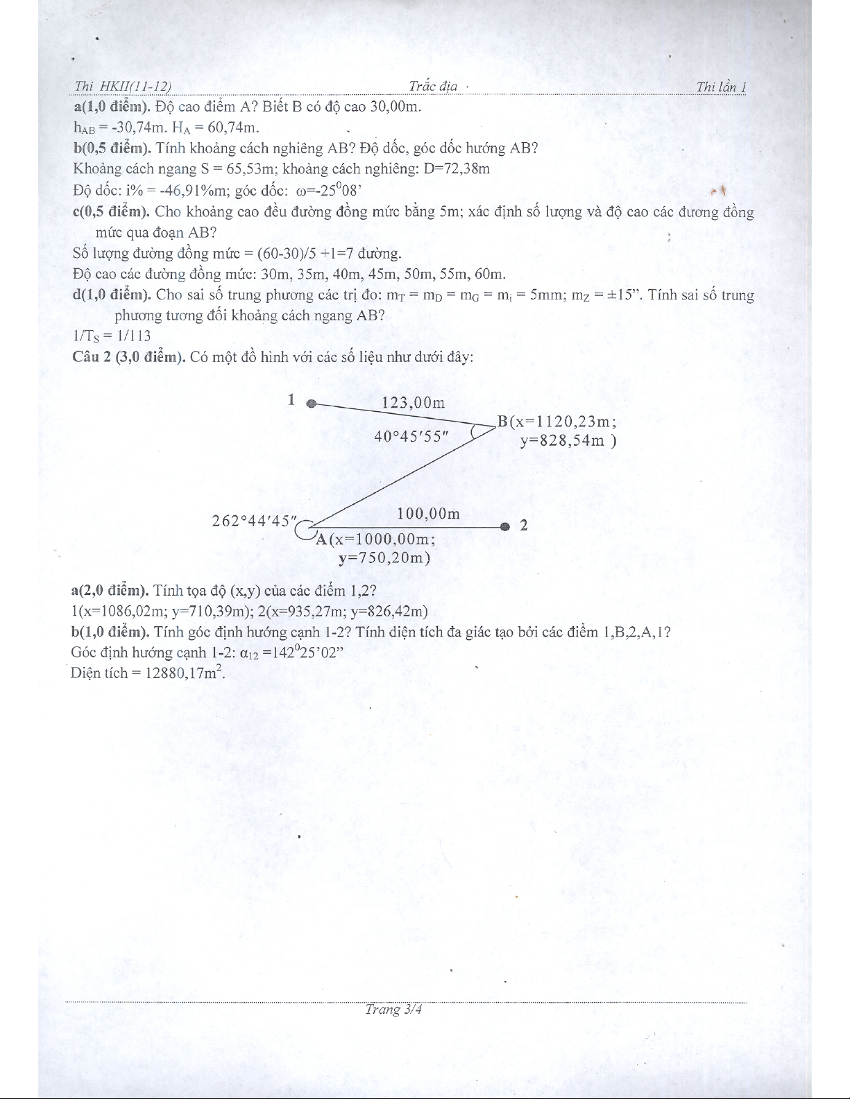 Đề thi và đáp án môn Trắc địa học kỳ 2