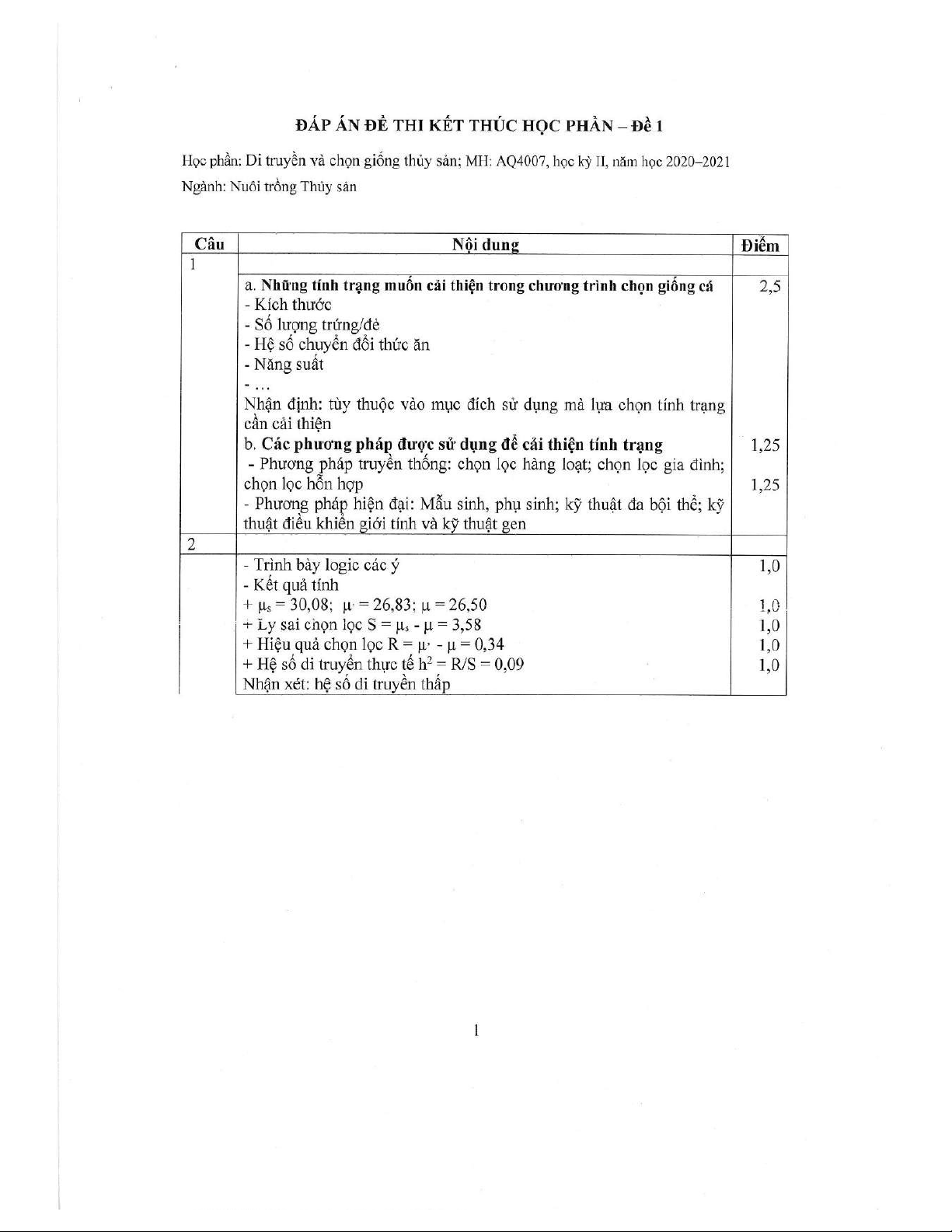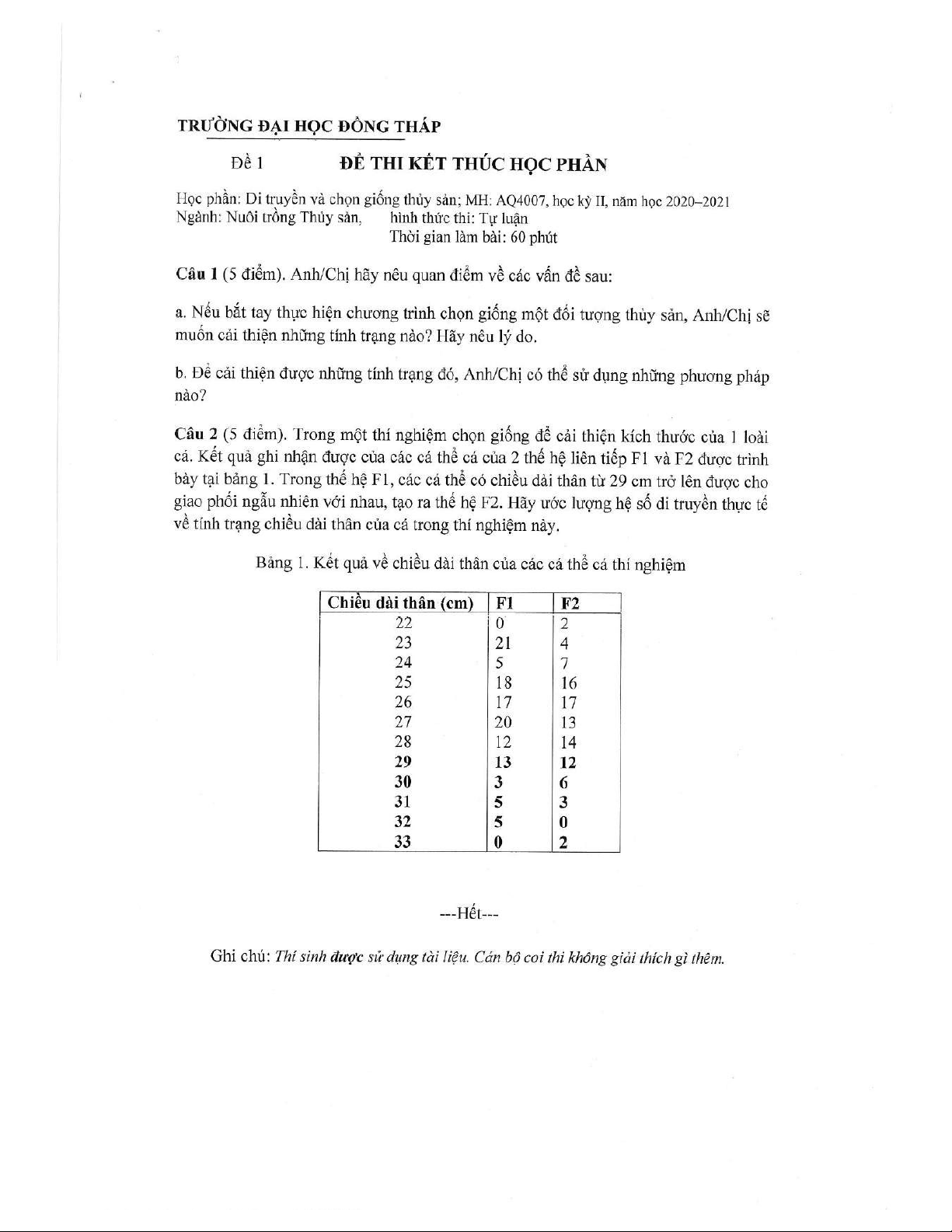 Đề thi kết thúc học phần học kì 2 môn Di truyền và chọn giống thủy sản năm 2020-2021 có đáp án - Trường ĐH Đồng Tháp