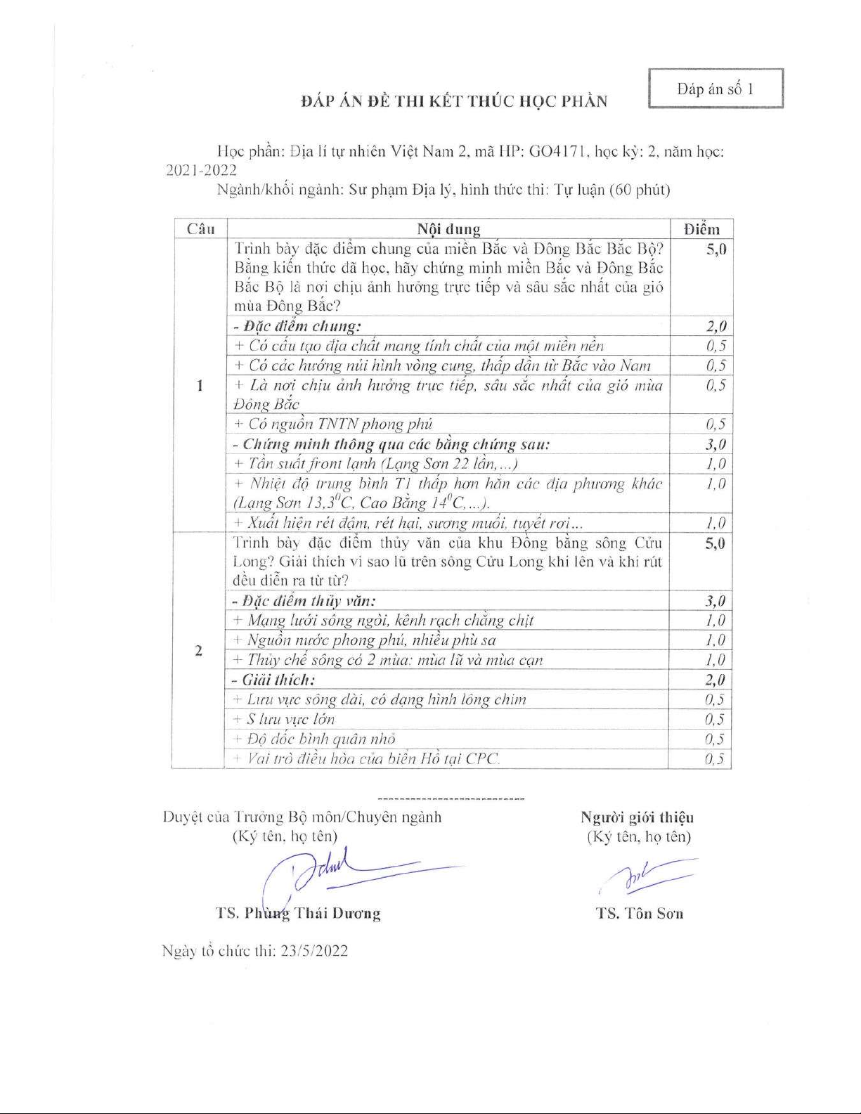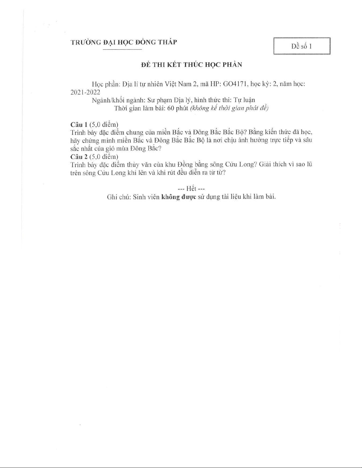 Đề thi kết thúc học phần học kì 2 môn Địa lí tự nhiên Việt Nam 2 năm 2021-2022 có đáp án - Trường ĐH Đồng Tháp