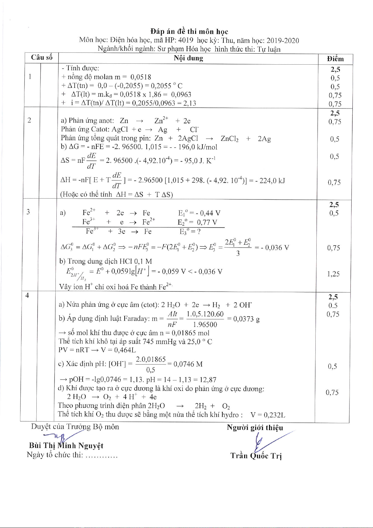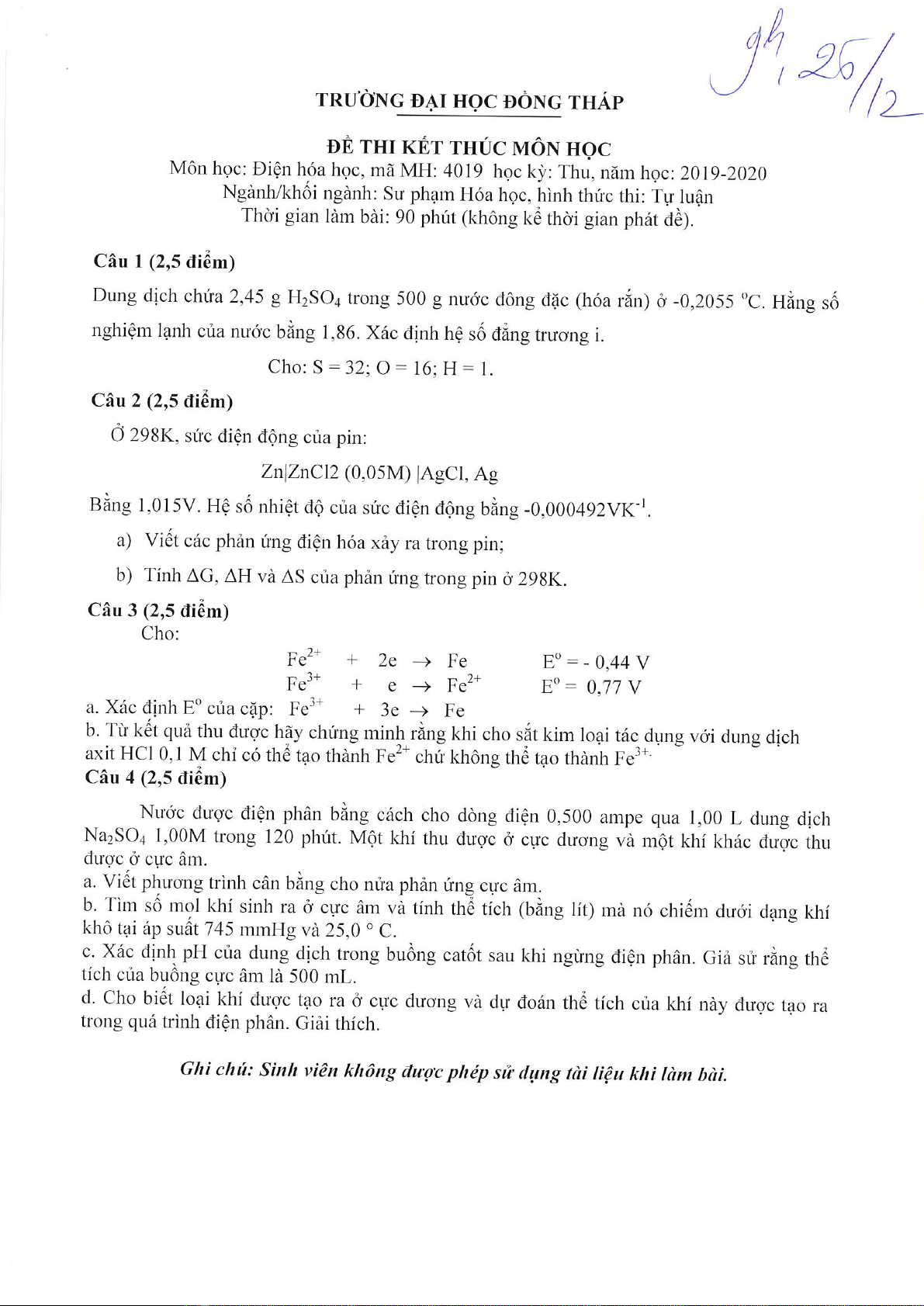 Đề thi kết thúc học phần học kì 1 môn Điện hóa học năm 2019-2020 có đáp án - Trường ĐH Đồng Tháp