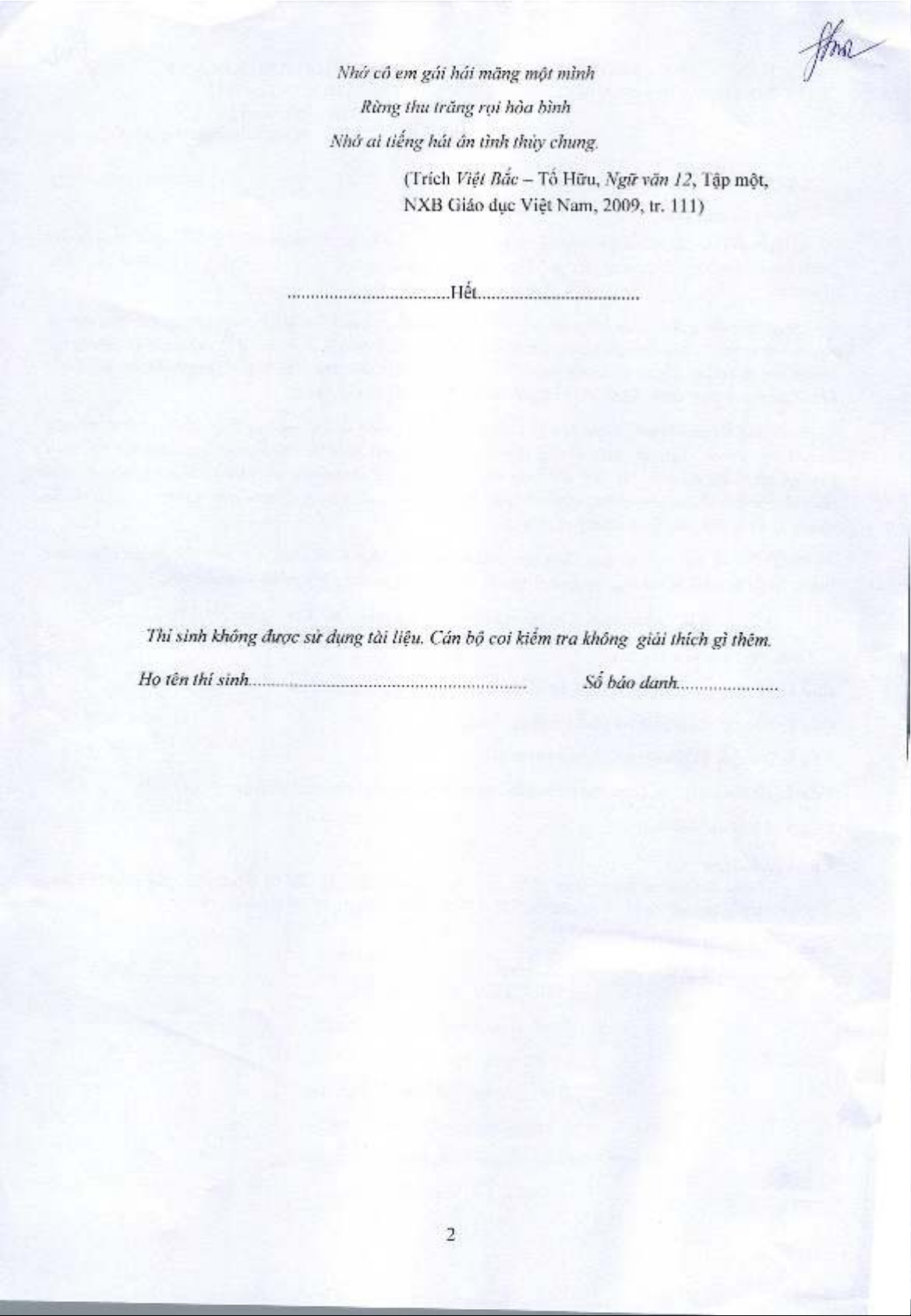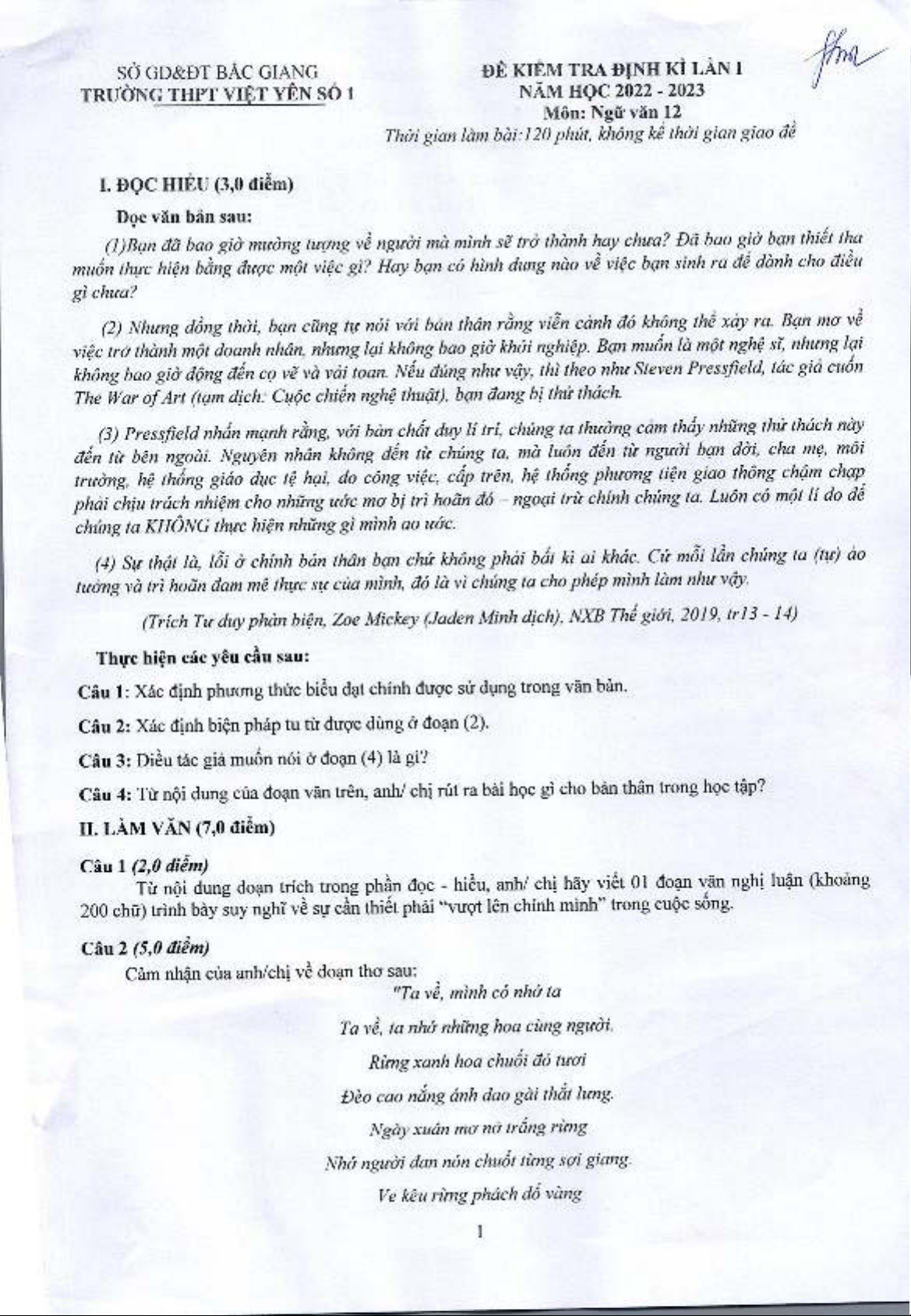 Đề thi định kì môn Ngữ văn lớp 12 năm 2022-2023 (Lần 1) - Trường THPT Việt Yên số 1