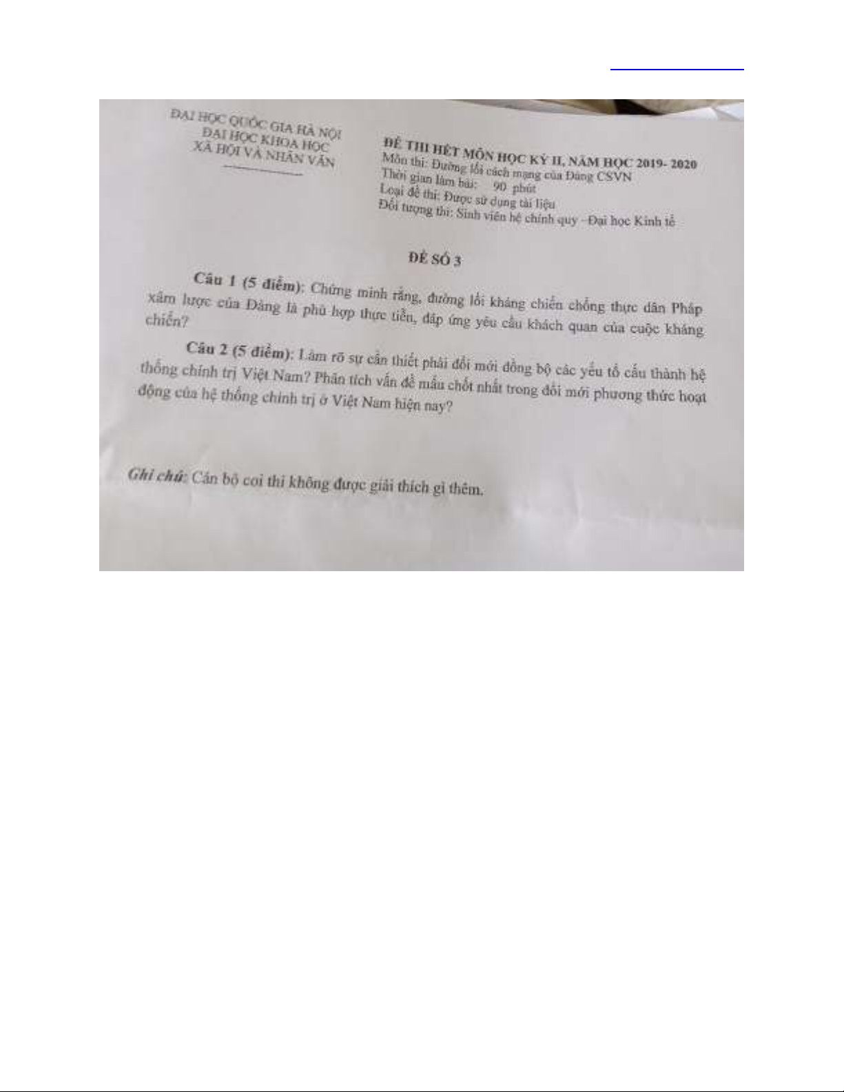 Đề thi hết môn học kỳ II năm học 2019-2020 môn Đường lối cách mạng của Đảng CSVN (Đề số 3) - ĐH Kinh tế