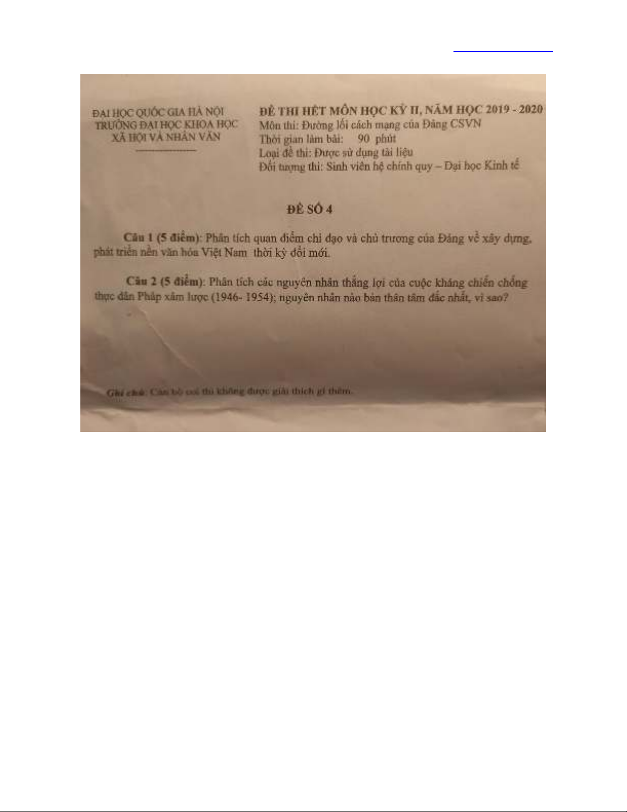 Đề thi hết môn học kỳ II năm học 2019-2020 môn Đường lối cách mạng của Đảng CSVN (Đề số 4) - ĐH Kinh tế