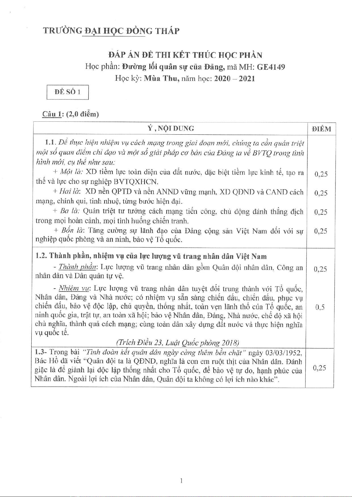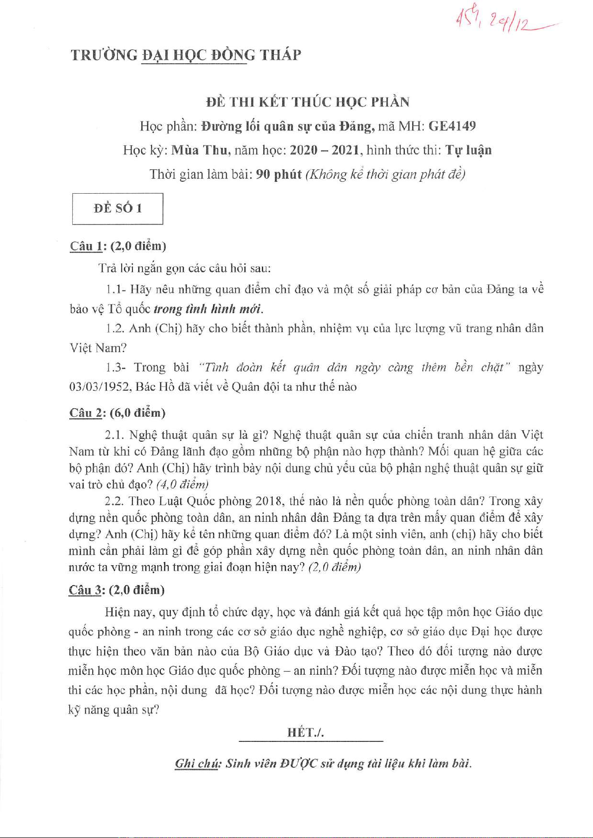 Đề thi kết thúc học phần học kì 1 môn Đường lối quân sự của Đảng năm 2020-2021 có đáp án - Trường ĐH Đồng Tháp