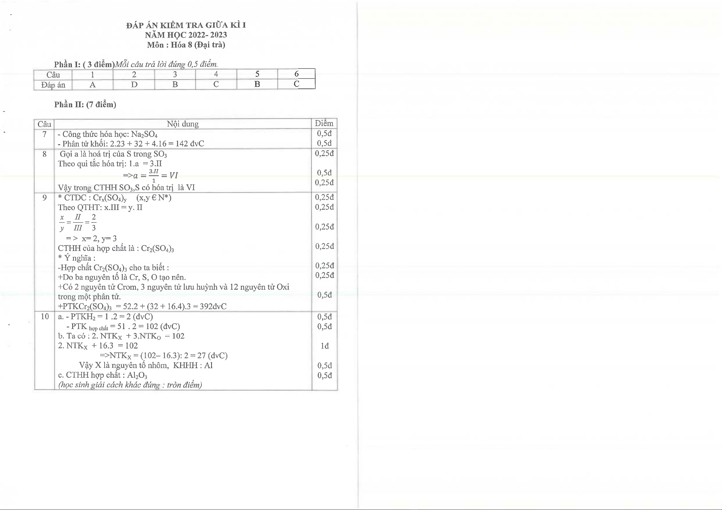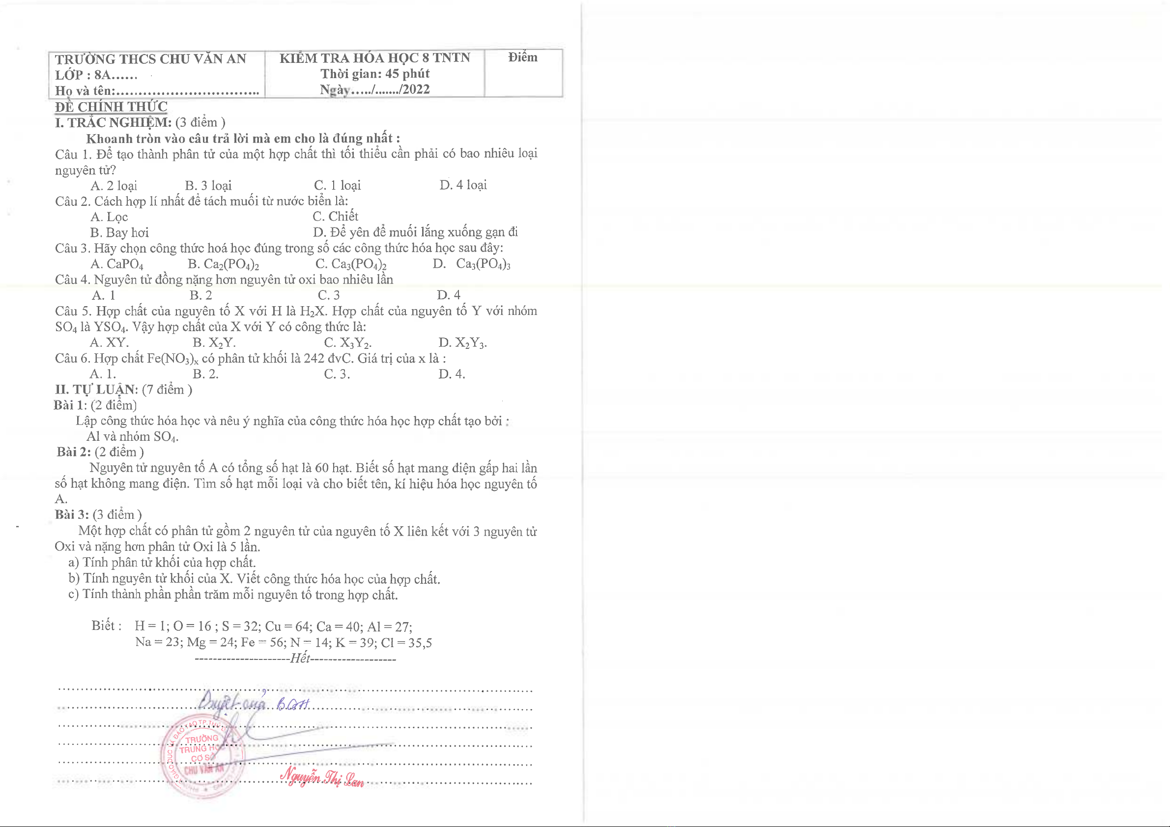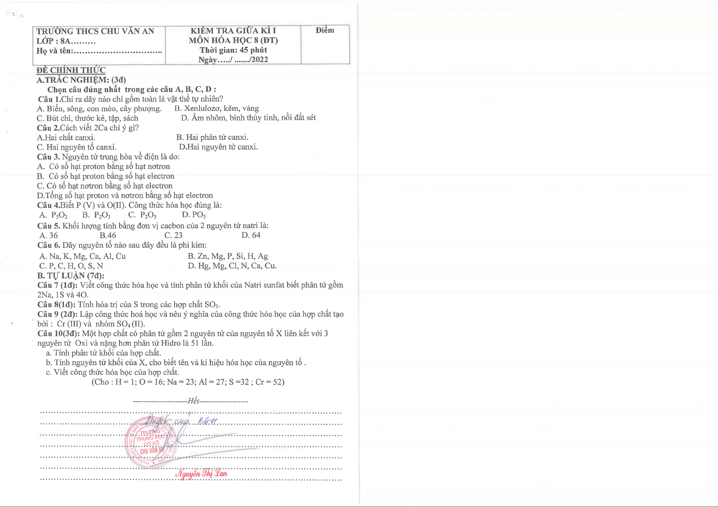 Đề thi giữa học kì 1 môn Hóa học lớp 8 năm 2022-2023 có đáp án - Trường THCS Chu Văn An, Thủ Dầu Một