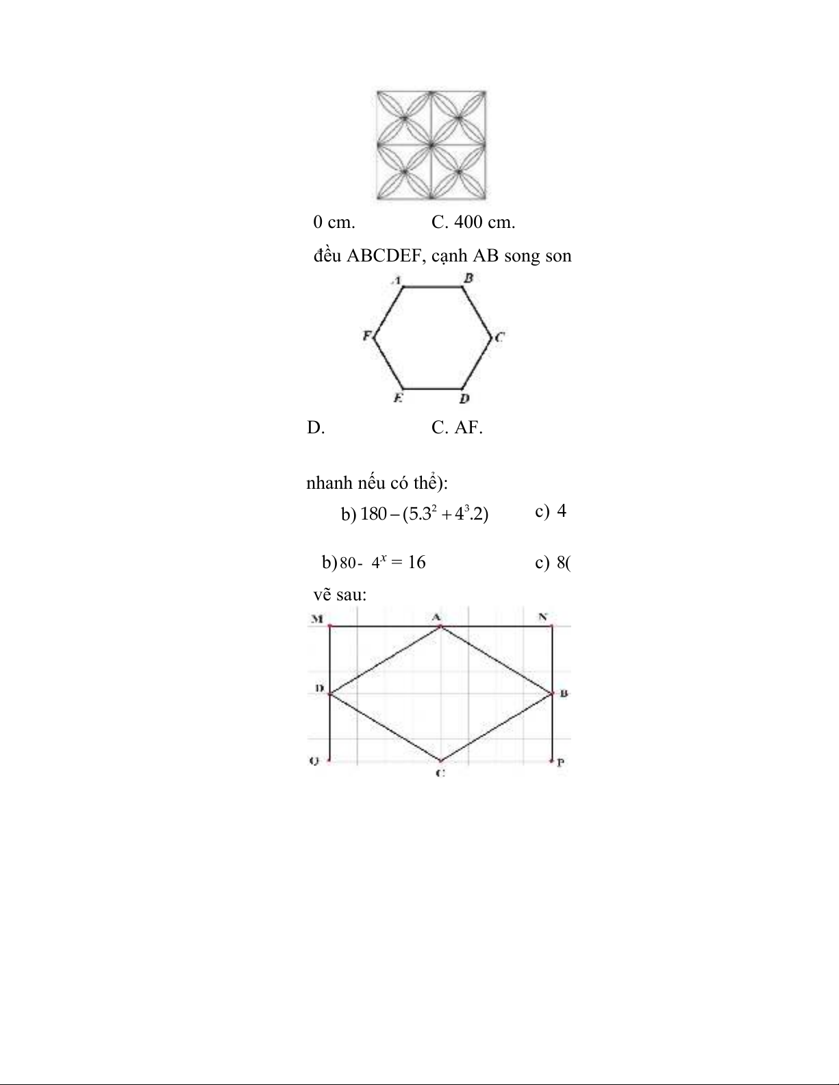 b) Biết độ dài MN = 8m; MQ = 4m. Tính diện tích hình chữ nhật và diện tích hình thoi.