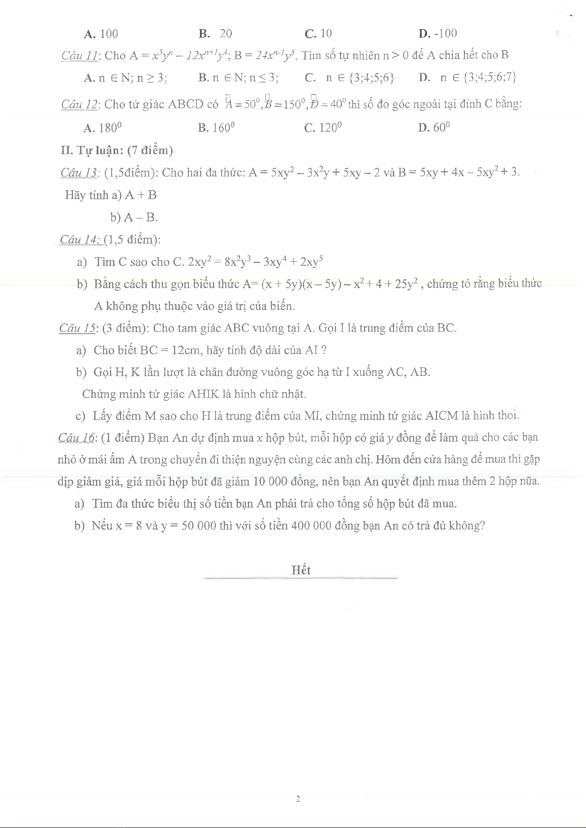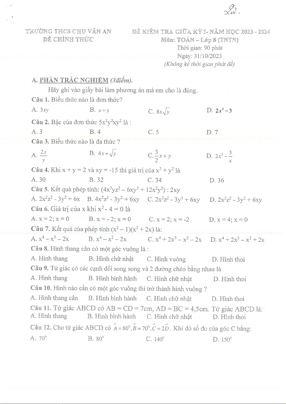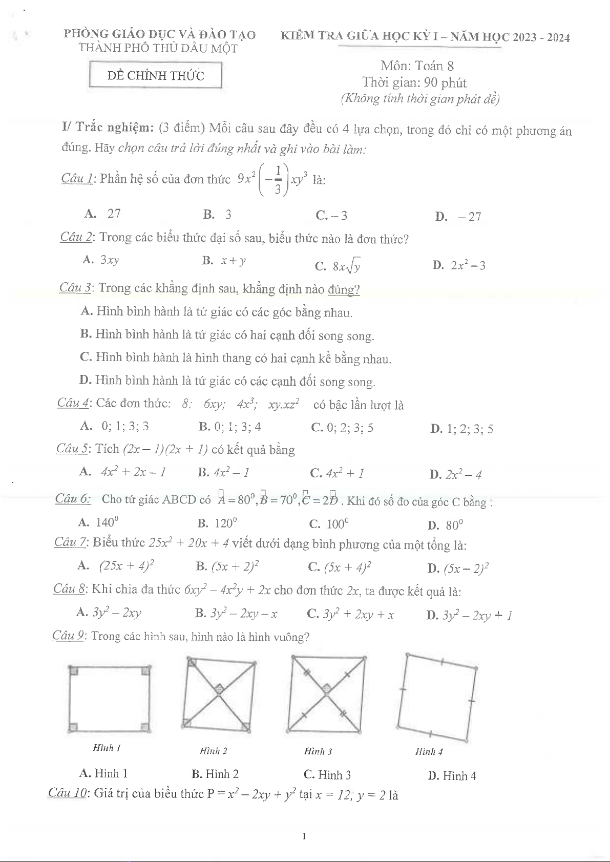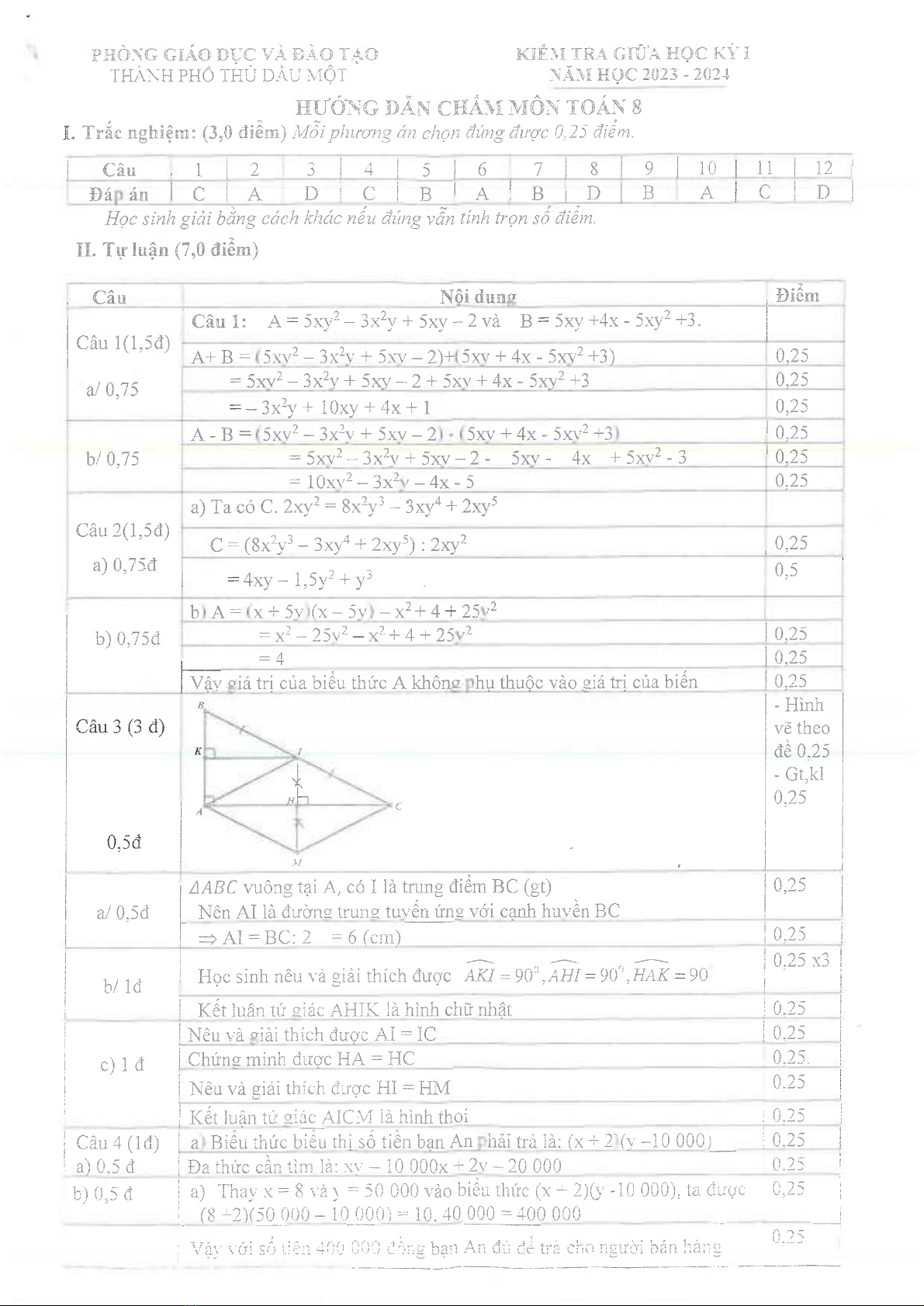 Đề thi giữa học kì 1 môn Toán lớp 8 năm 2023-2024 có đáp án - Phòng GD&ĐT Thủ Dầu Một