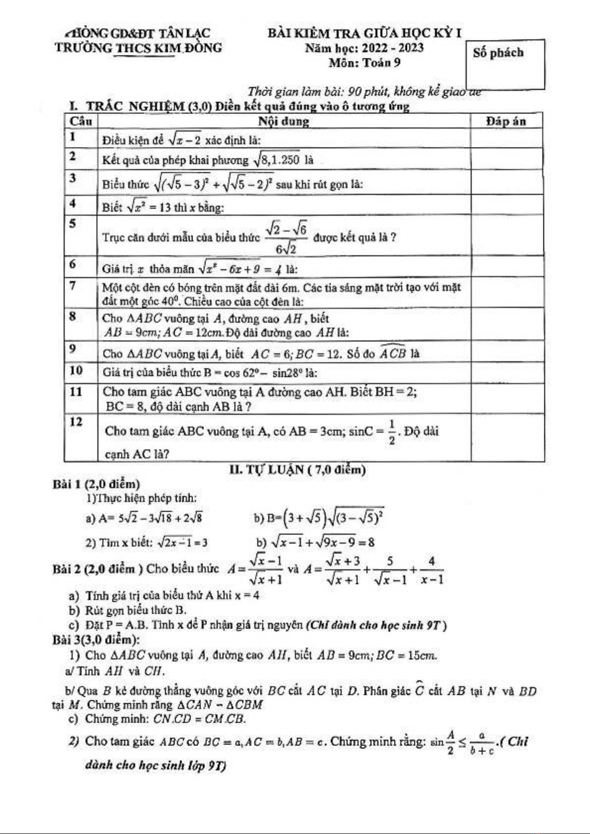 Đề thi giữa học kì 1 môn Toán lớp 9 năm 2022-2023 - Trường THCS Kim Đồng – Hòa Bình