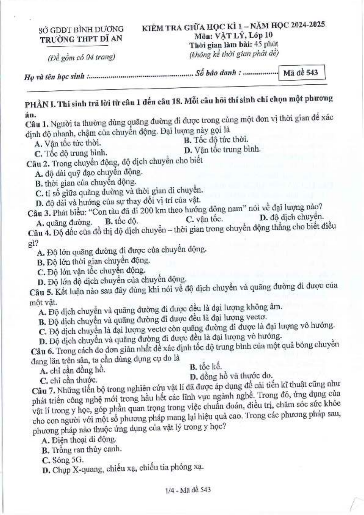 Đề thi giữa học kì 1 môn Vật lý lớp 10 năm 2024-2025 - Trường THPT Dĩ An, Bình Dương