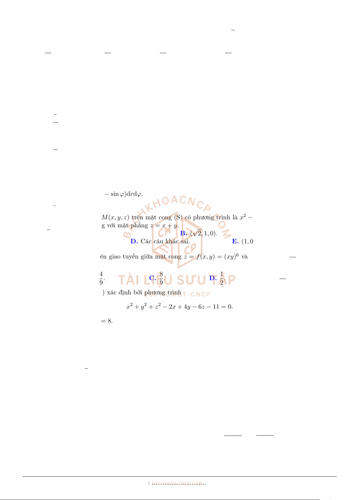Câu 11. Điểm cao nhất trên giao tuyến giữa mặt cong z=f(x, y) = (xy)6và mặt trụ x2+y2