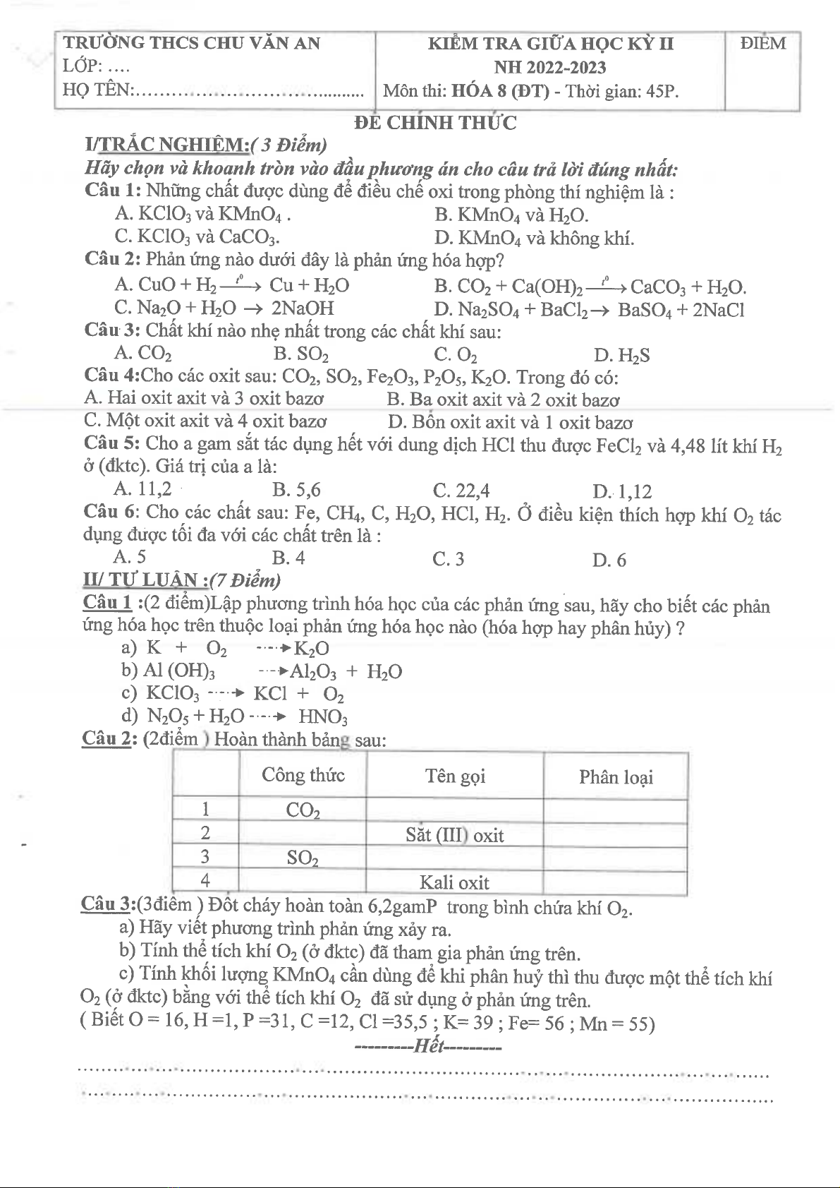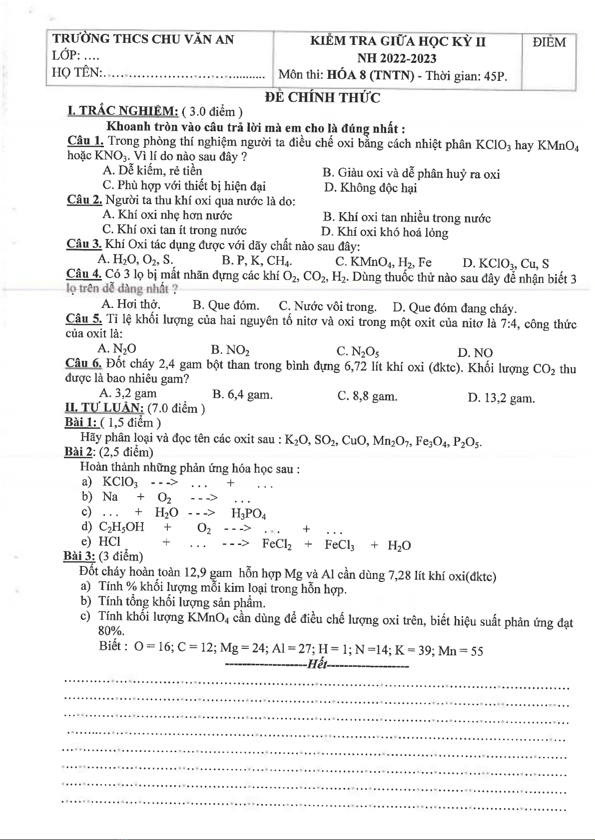 Đề thi giữa học kì 2 môn Hóa học lớp 8 năm 2022-2023 có đáp án - Trường THCS Chu Văn An, Thủ Dầu Một