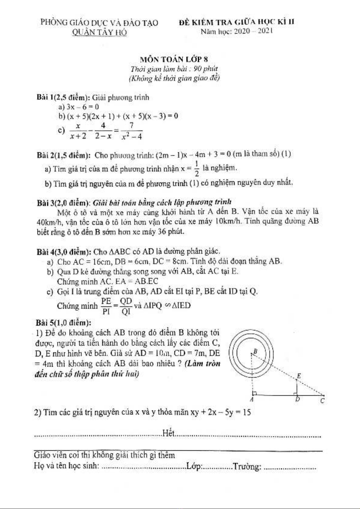 Đề thi giữa học kì 2 môn Toán lớp 8 năm 2020-2021 - Phòng GD&ĐT Quận Tây Hồ