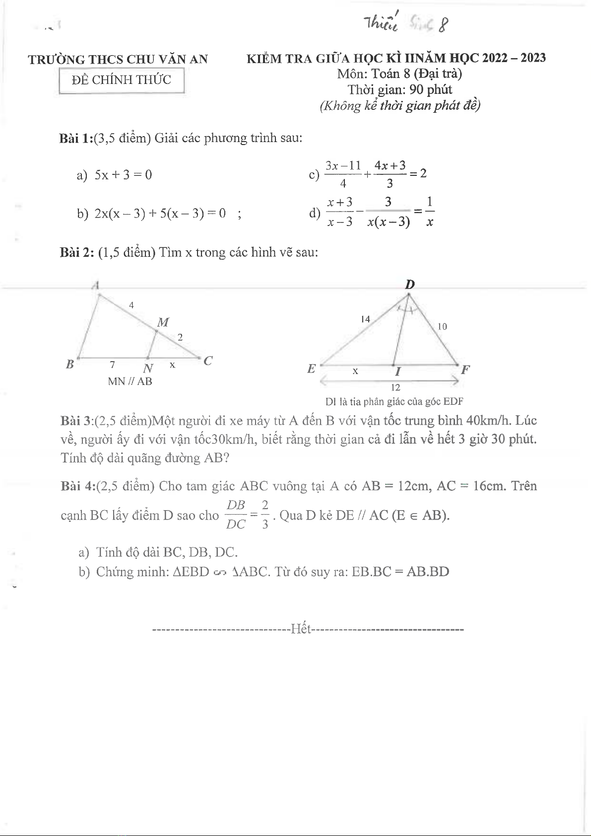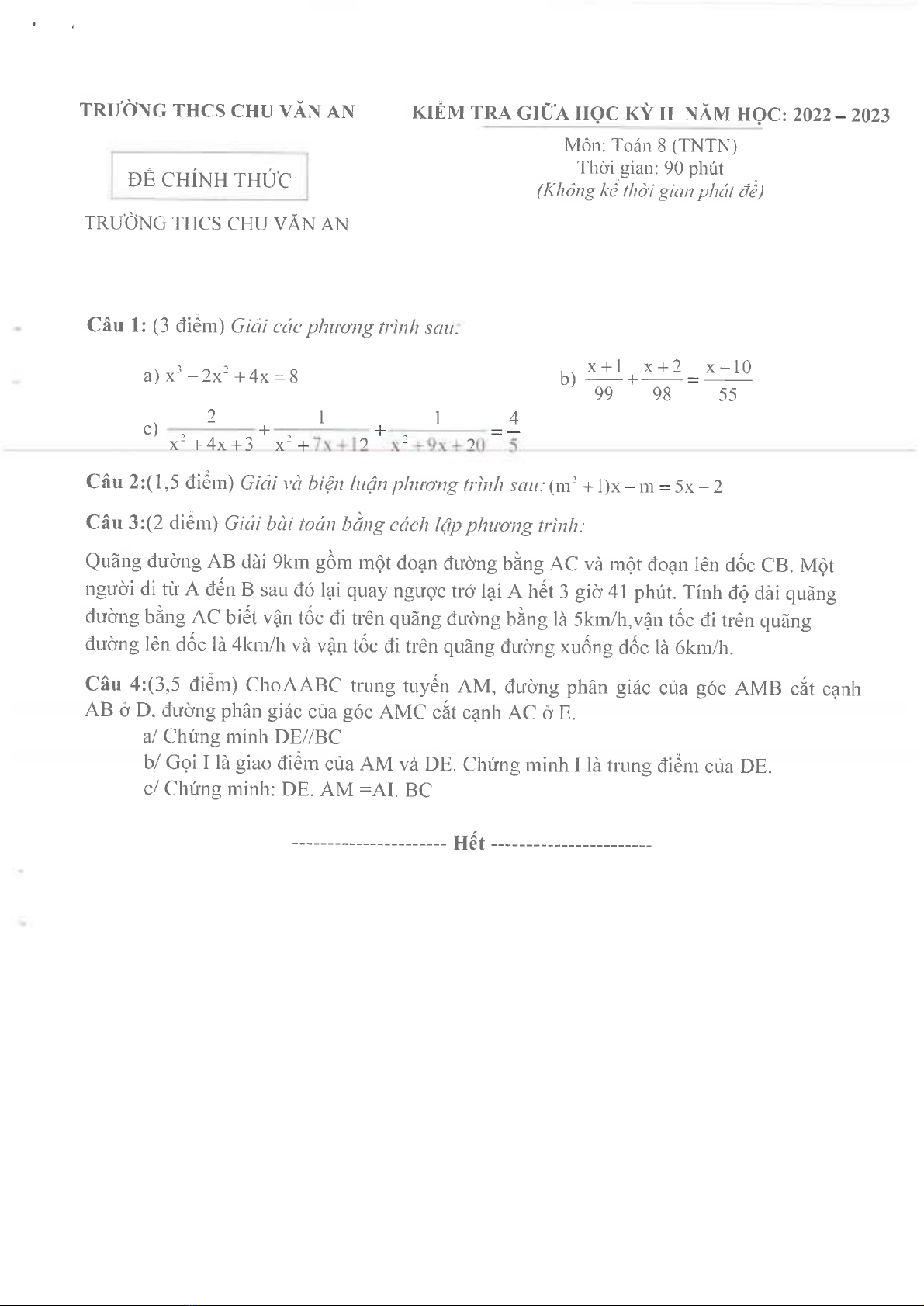 Đề thi giữa học kì 2 môn Toán lớp 8 năm 2022-2023 có đáp án - Trường THCS Chu Văn An, Thủ Dầu Một