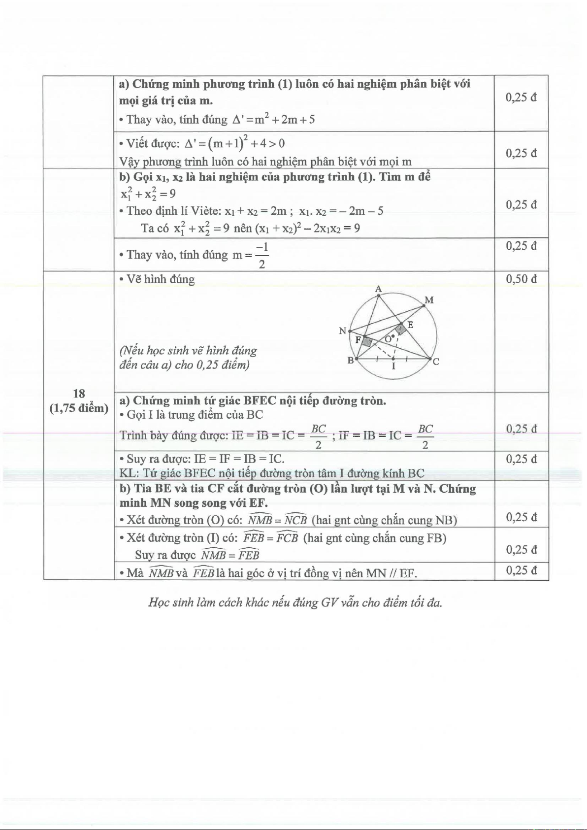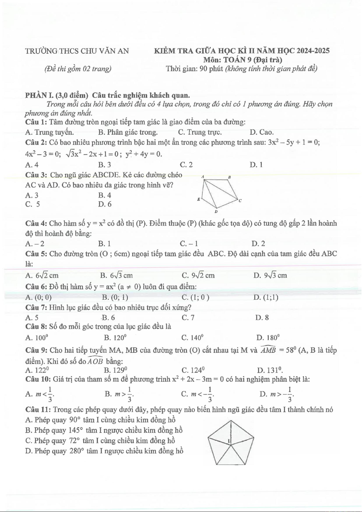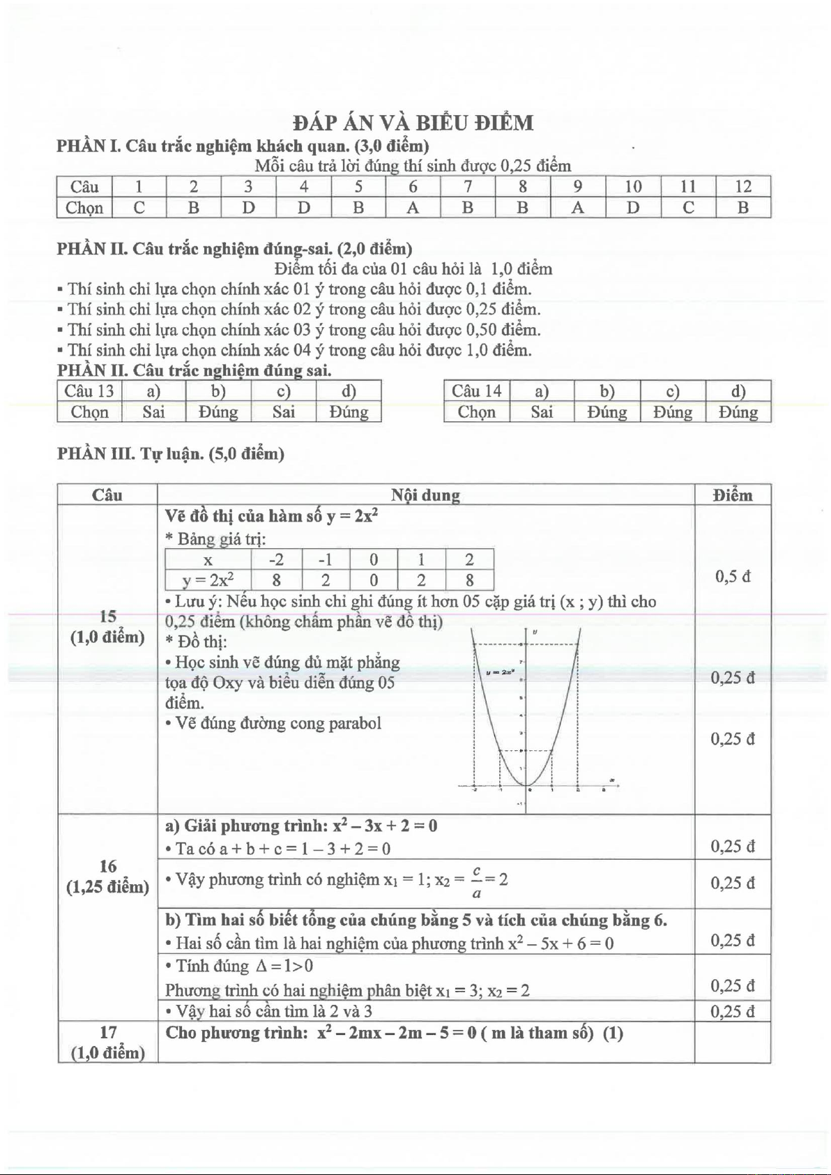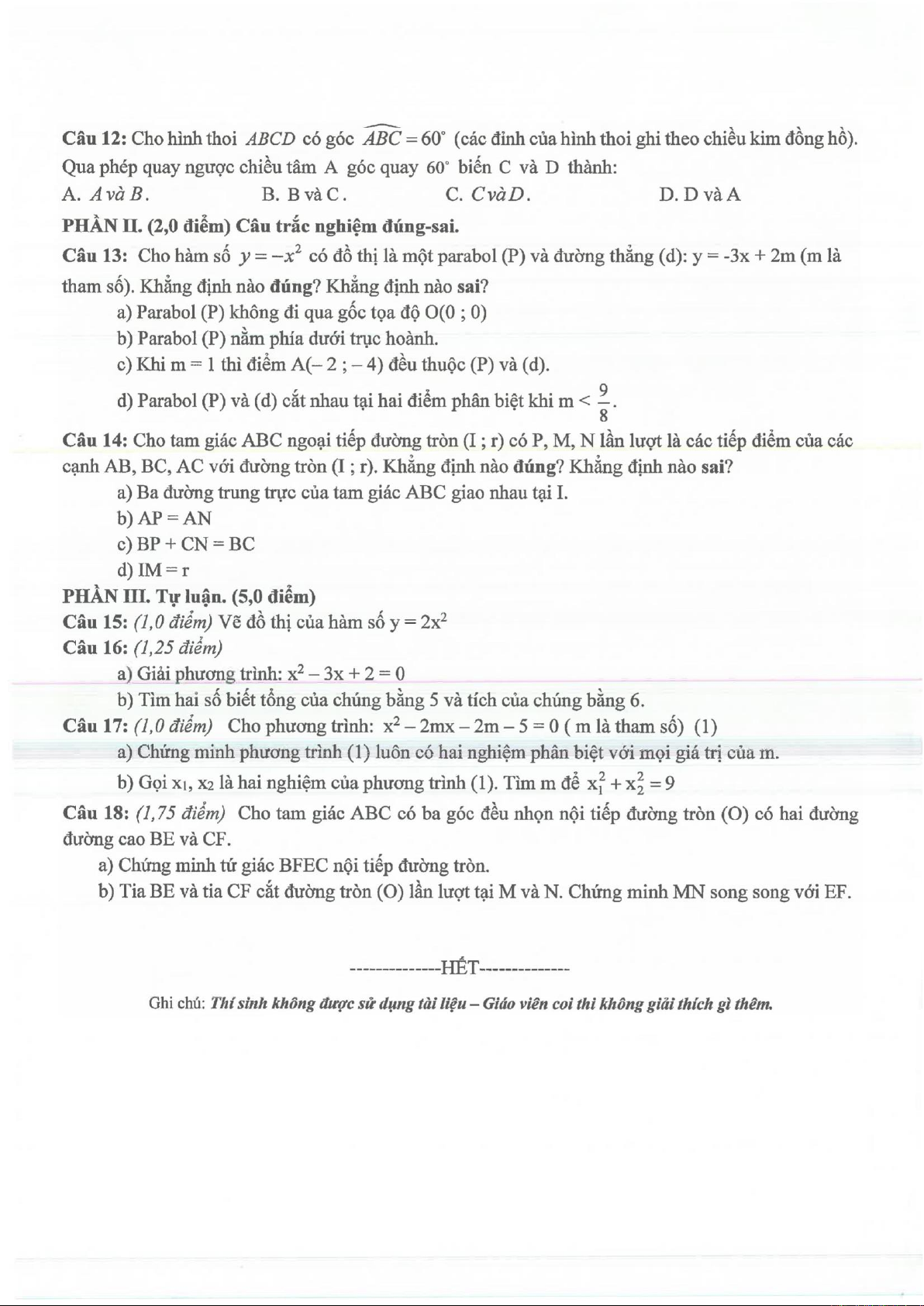 Đề kiểm tra Toán lớp 9 học kỳ II được cấu trúc thành ba phần chính, bao gồm câu hỏi trắc nghiệm khách quan, trắc nghiệm đúng-sai và tự luận, tổng cộng 18 câu hỏi. Phần trắc nghiệm khách quan và đúng-sai tập trung kiểm tra kiến thức nền tảng và khả năng nhận diện các tính chất toán học. Trong đó, các câu hỏi đại số đề cập đến việc giải phương trình bậc hai, xác định nghiệm, và các tính chất của hàm số bậc hai cùng đồ thị parabol. Các vấn đề hình học bao gồm tính toán khoảng cách, phép quay, các tính chất của tam giác, và đặc biệt là các mối quan hệ trong đường tròn như góc nội tiếp, tứ giác nội tiếp. Phần tự luận yêu cầu học sinh trình bày chi tiết lời giải, qua đó đánh giá sâu hơn khả năng tư duy logic và kỹ năng giải toán. Các bài toán tự luận bao gồm vẽ đồ thị hàm số bậc hai y = 2x², giải các phương trình bậc hai cơ bản và nâng cao có chứa tham số, ứng dụng hệ thức Viète để tìm mối liên hệ giữa các nghiệm, và chứng minh các tính chất hình học phức tạp hơn liên quan đến tứ giác nội tiếp và đường thẳng song song trong đường tròn. Cách tiếp cận này giúp đánh giá toàn diện từ việc nắm vững định nghĩa, công thức đến khả năng ứng dụng linh hoạt các định lý để giải quyết các vấn đề đa dạng. Giá trị ứng dụng của đề thi không chỉ dừng lại ở việc xếp loại học sinh mà còn cung cấp thông tin phản hồi quý giá cho giáo viên và học sinh để điều chỉnh phương pháp dạy và học, nhằm củng cố các kỹ năng cần thiết cho các kỳ thi quan trọng sắp tới.
