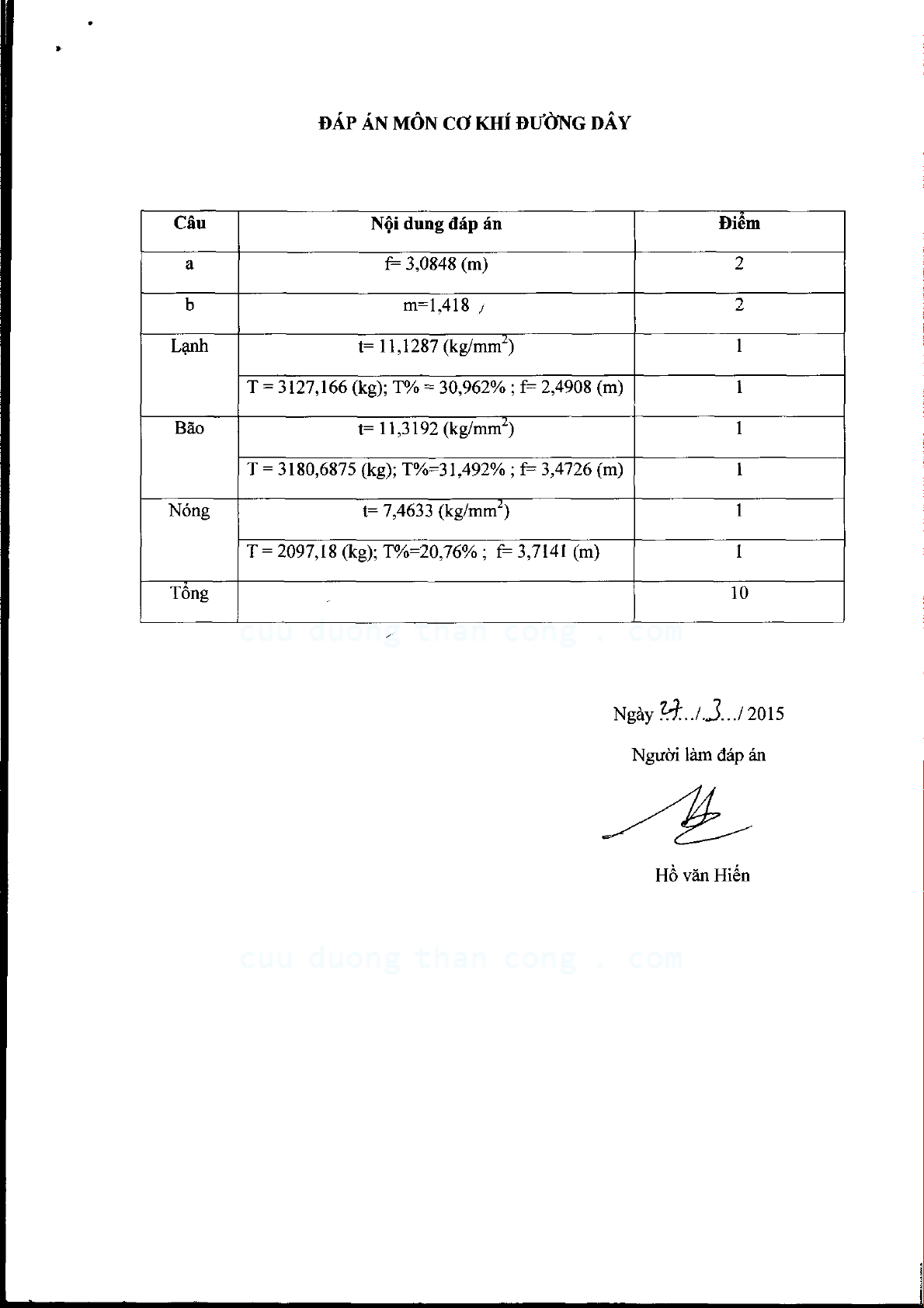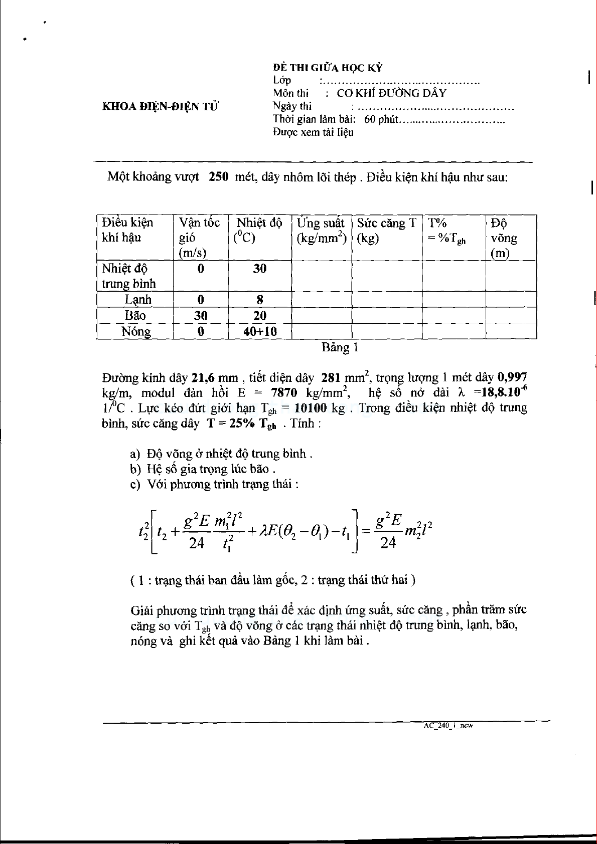 Đề thi giữa học kỳ môn Cơ khí đường dây - Năm học 2015